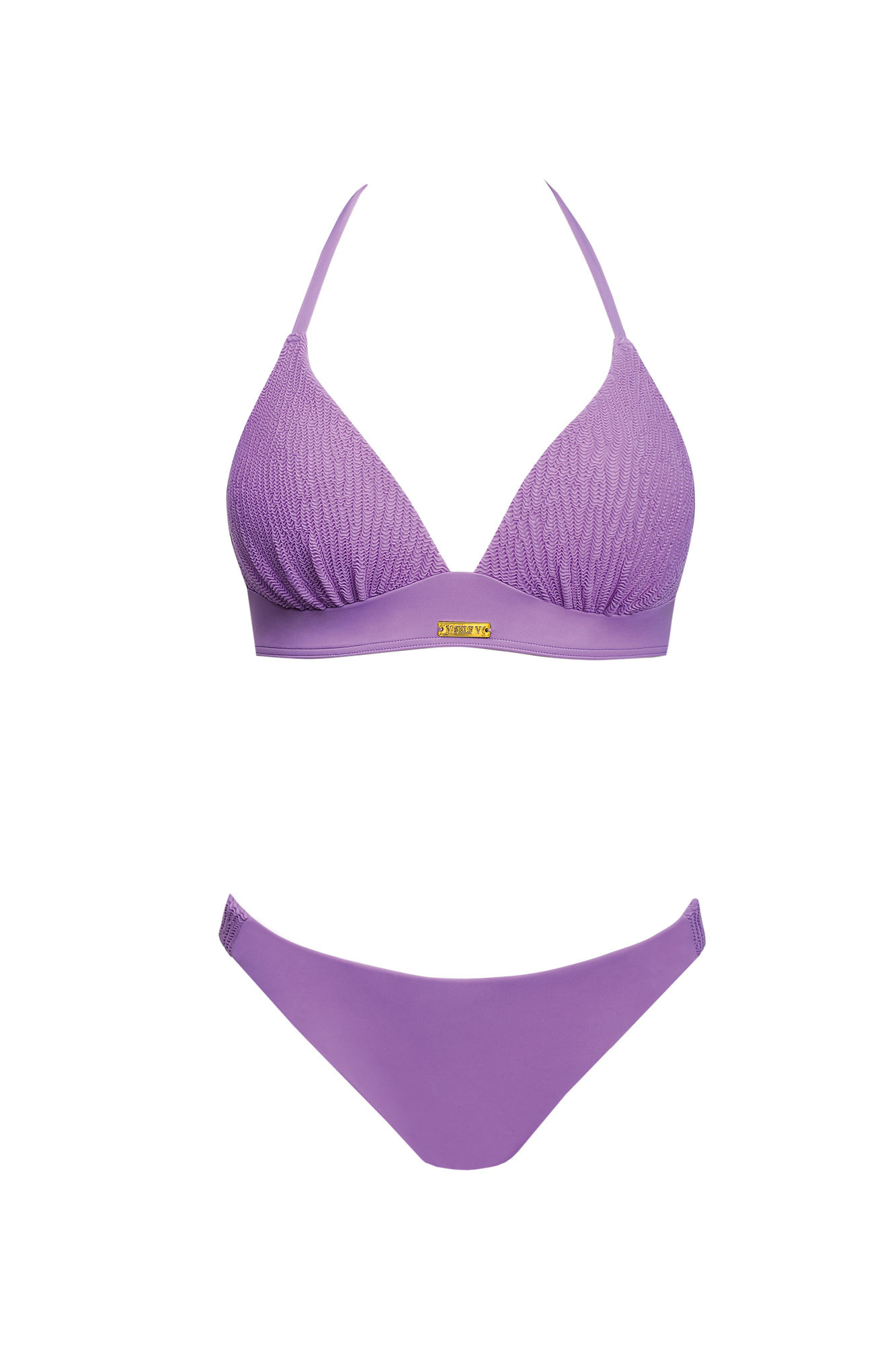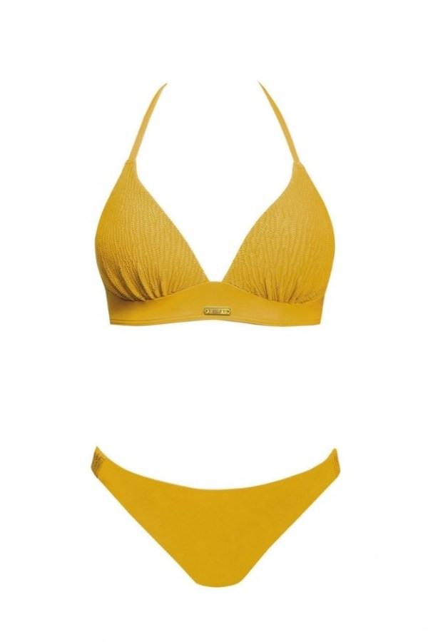 Dámské dvoudílné plavky, vrchní díl vyztužený, bez kostice, zadní část na zapínání, vrchní část na zavazování za krkem. Spodní díl klasického střihu tai.