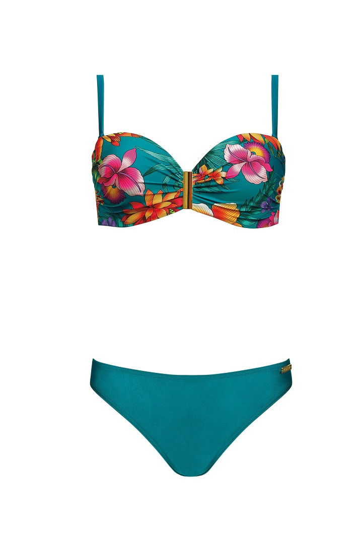 Dámské dvudílné plavky s potiskem exotických květů. Spodní díl klasické kalhotky, vrchní díl vyztužený, odepínací ramínka na posouvání.