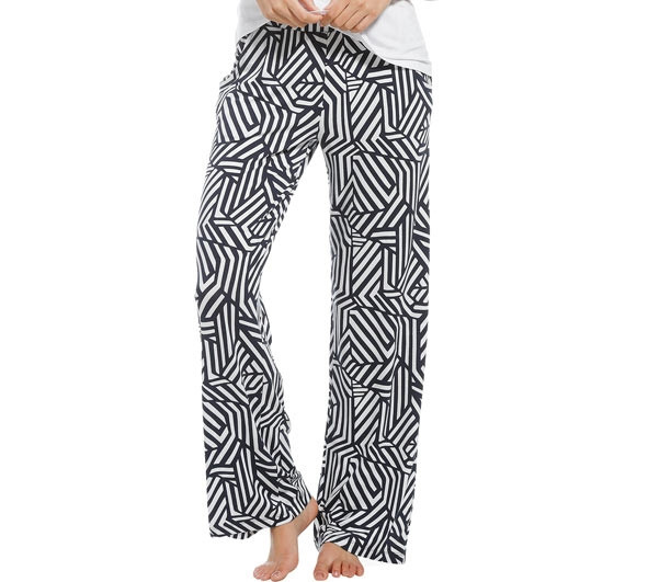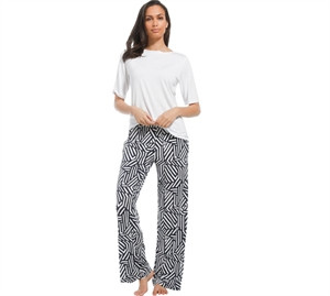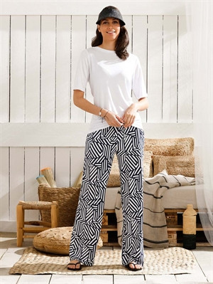 Plážové kalhoty Pastunette s kapsami – elegantní tmavě modré společenské kalhoty, noční kalhoty nebo plážové kalhoty s bílým grafickým potiskem. Možná znáte měkké vlastnosti kvality Bamboo? S viskózou získáte úplně stejné vlastnosti. Fantastický komfort a měkkost, která je příjemná na těle, s fantastickými vlastnostmi pro regulaci teploty a odvodu potu. Měkký žerzej vyrobený z rostlinných a dřevěných vláken