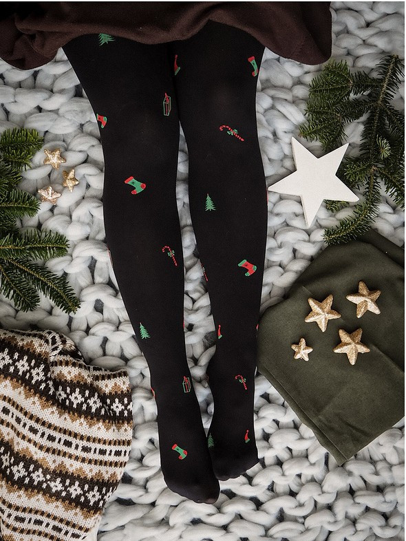 Punčocháče jsou vyrobené z matného krycího mikrovlákna a jsou ozdobené svátečním vánočním vzorem. Model má malý klín.