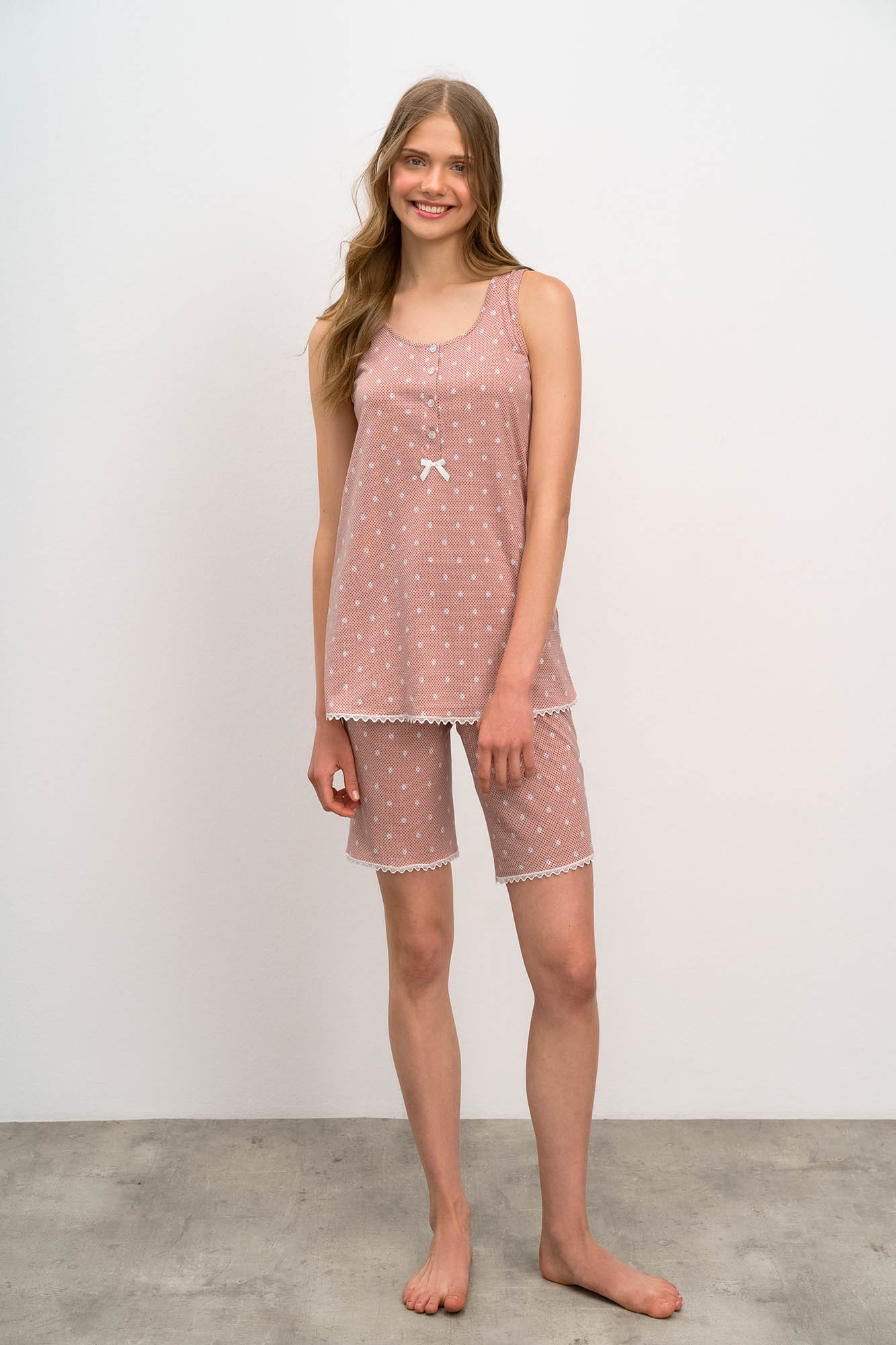 Dvoudílné dámské pyžamo pro pohodlný spánek. Pyžamo je vyrobené z vysoce kvalitní, genetický nemodifikované řecké bavlny, která poskytuje vysoké pohodlí, příjemný pocit na dotek, prodyšnost, pružnost a odolnost.
