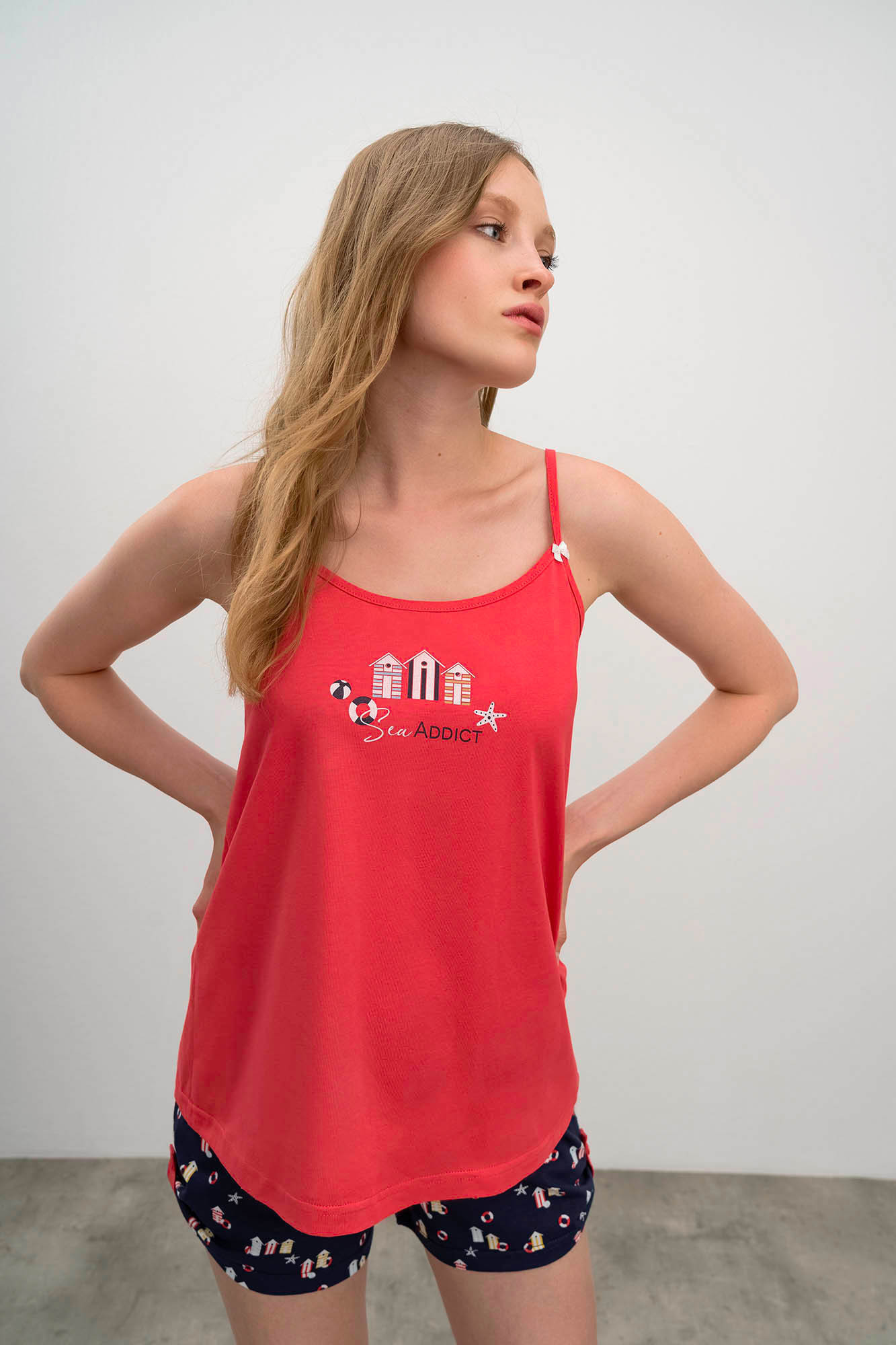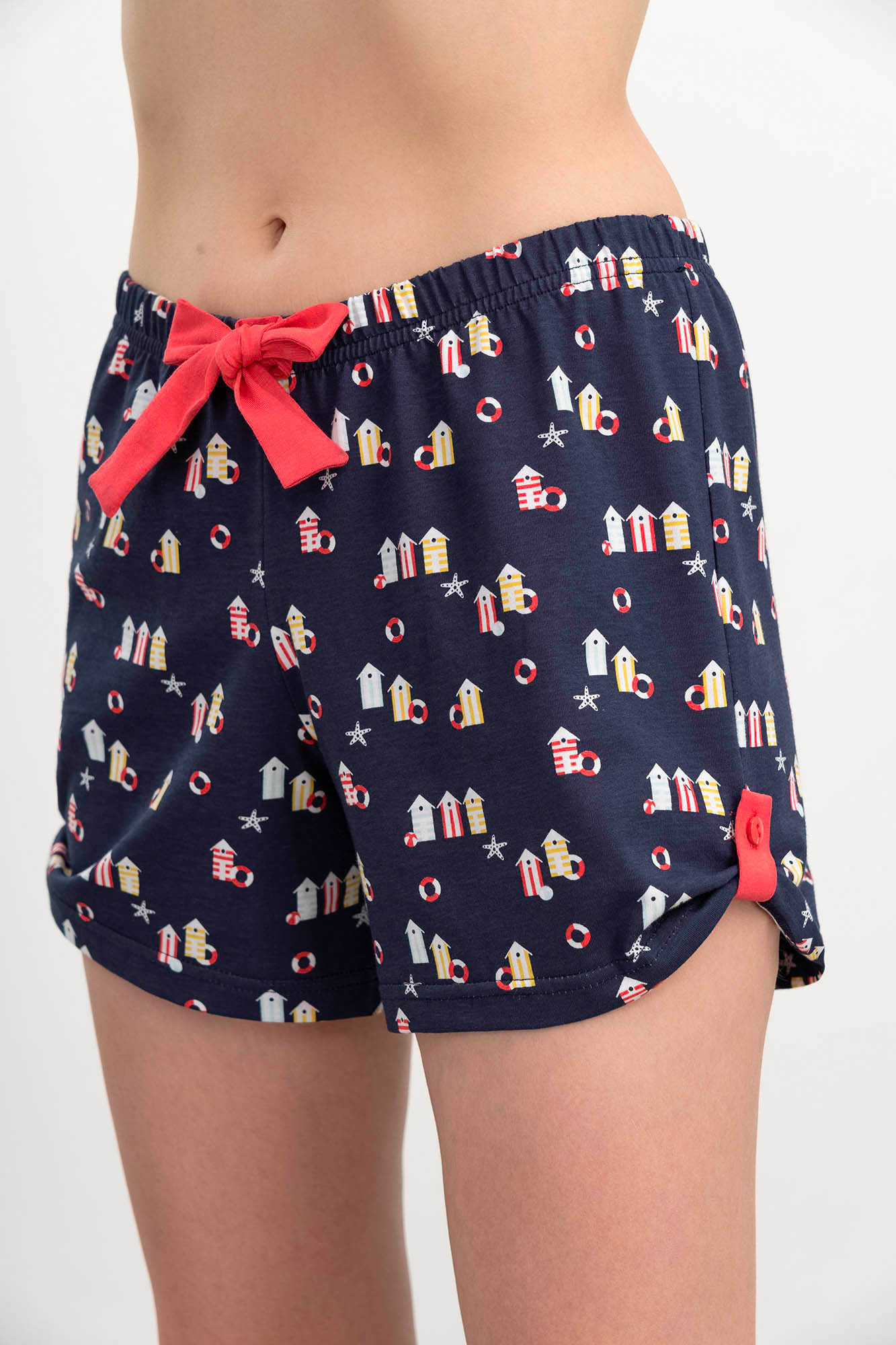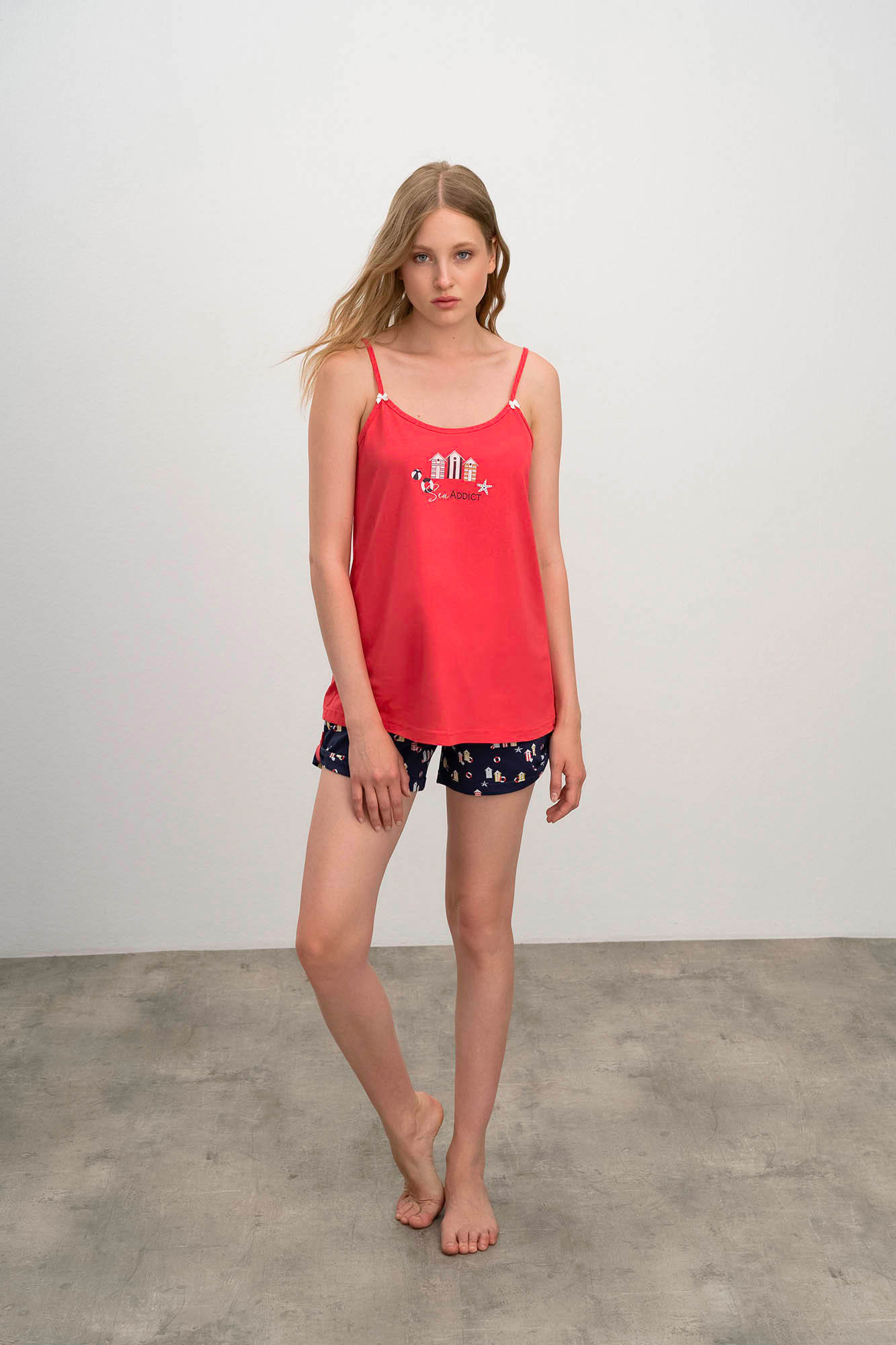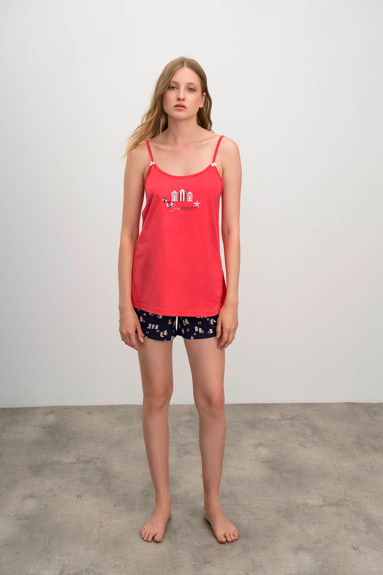 Dvoudílné dámské pyžamo pro pohodlný spánek. Komplet sestává z jednobarevné košilky na ramínka s kulatým výstřihem, který dopňují krátké šortky s potiskem domečků s pohodlnou gumou v pase. Pyžamo je vyrobené z vysoce kvalitní, genetický nemodifikované řecké bavlny, která poskytuje vysoké pohodlí, příjemný pocit na dotek, prodyšnost, pružnost a odolnost.