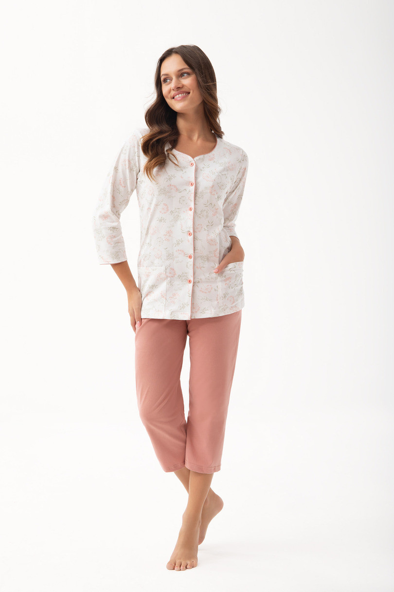 Dámské pyžamo značky Luna, 3/4 kalhoty, jednobarevné. Góra s potiskem květin, rozepínání, kapsy, zdobené lemováním, 3/4 rukávy.