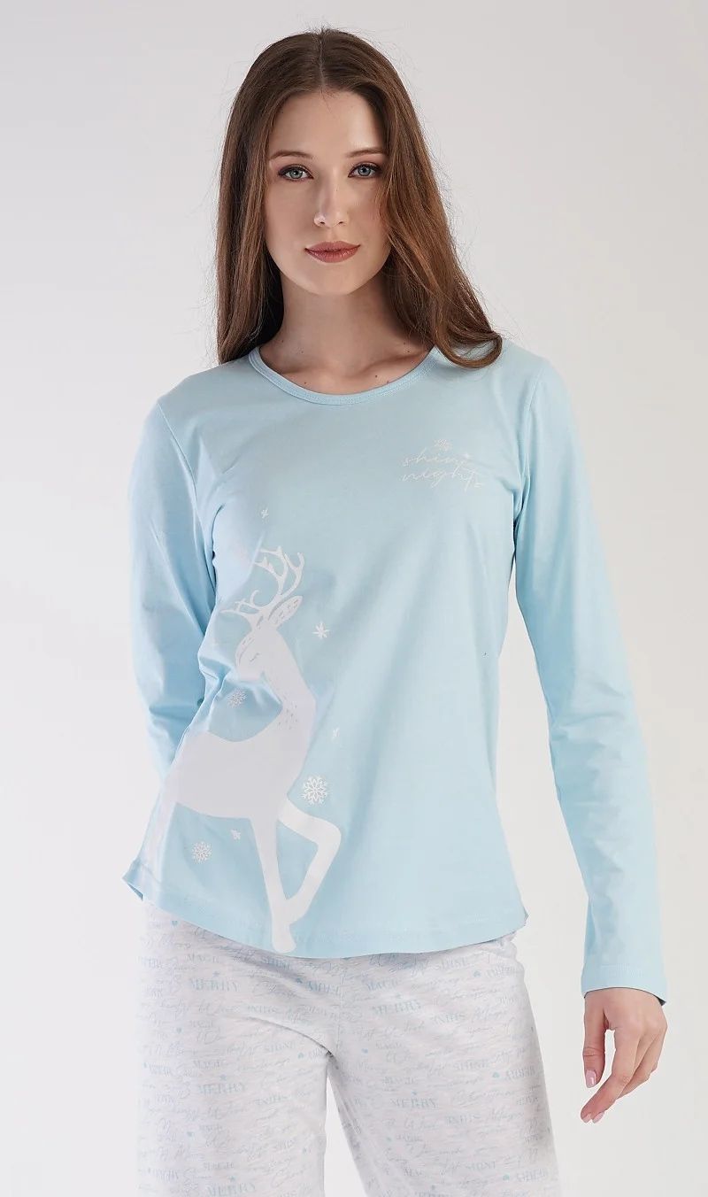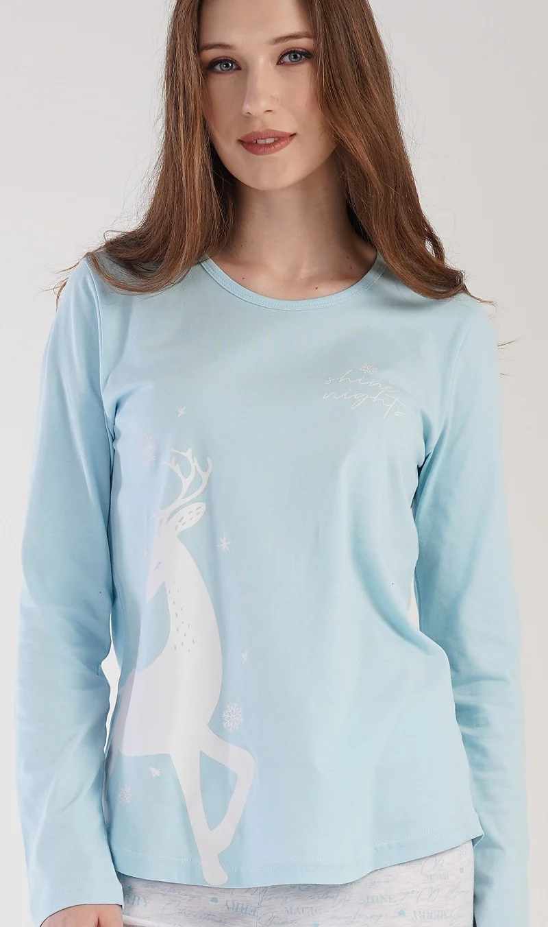 Dámské pyžamo dlouhé Jelen. Dámské pyžamo se skládá z trika s dlouhým rukávem a dlouhých kalhot. Triko je jednobarevné, zdobené obrázkem bílého jelena a jemným nápisem SHINE NIGHTS. Kalhoty jsou světle šedé, potištěné modrými nápisy. Kalhoty mají v pase gumu a šňůrku na stažení. Použitý materiál je poddajný a příjemný na dotek. Triko je složeno ze 100% bavlnou, kalhoty mají obsah bavlny 70%.