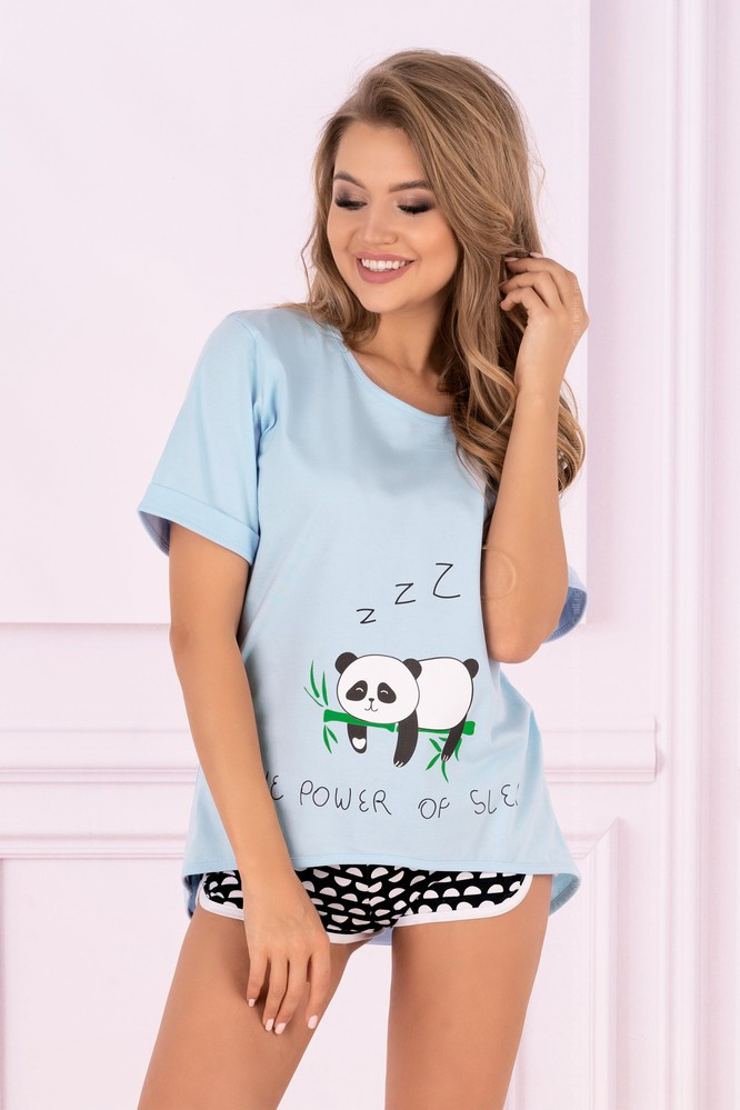 pro ženy a dívky. Na světle modré halence potisk pandy spící na bambusu. Zadní díl trička je v prodloužené délce. Spodní díl krátké černé šortky s bílými půl-puntíky.