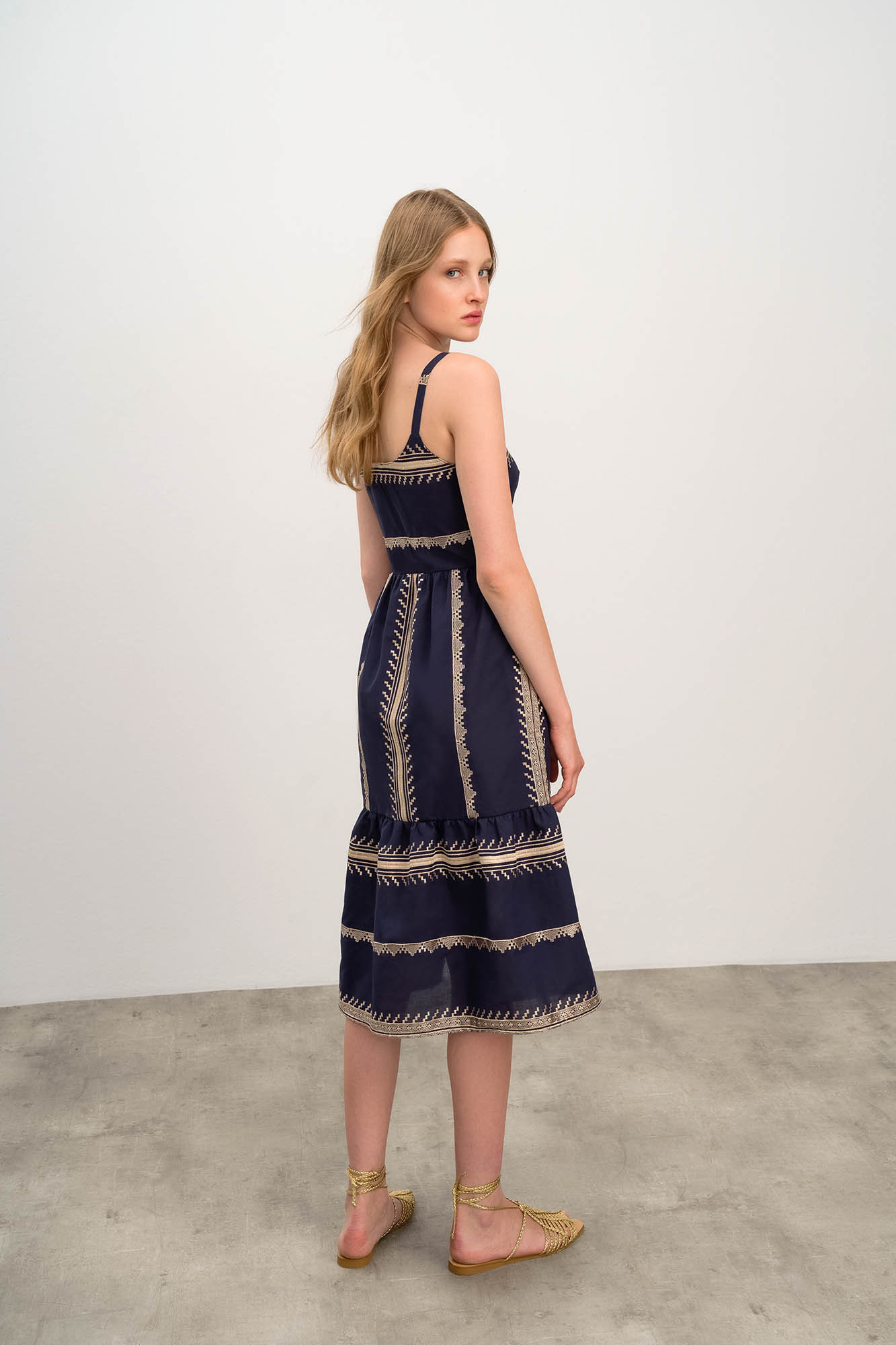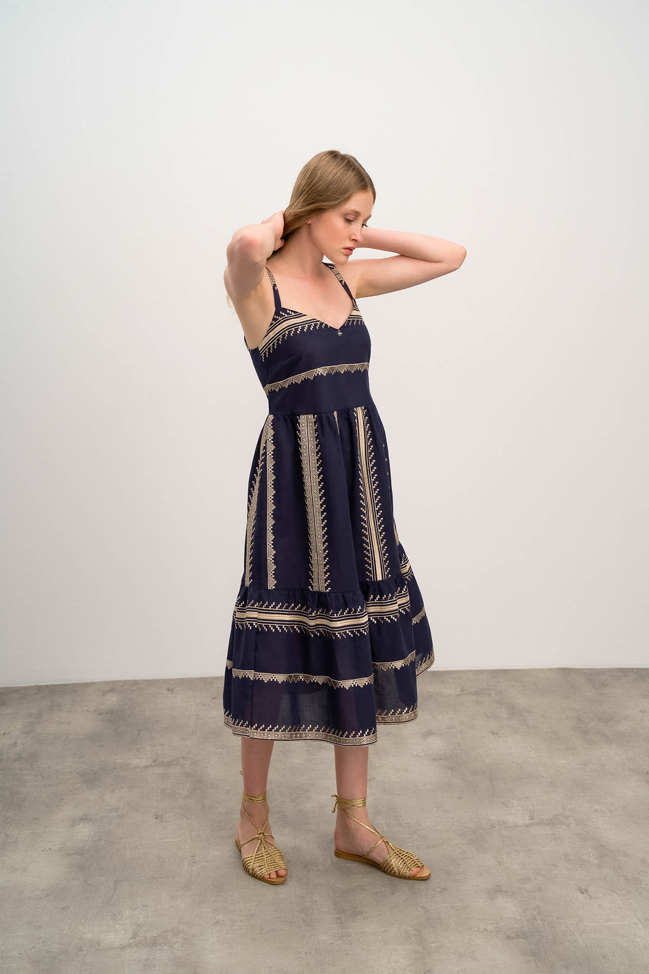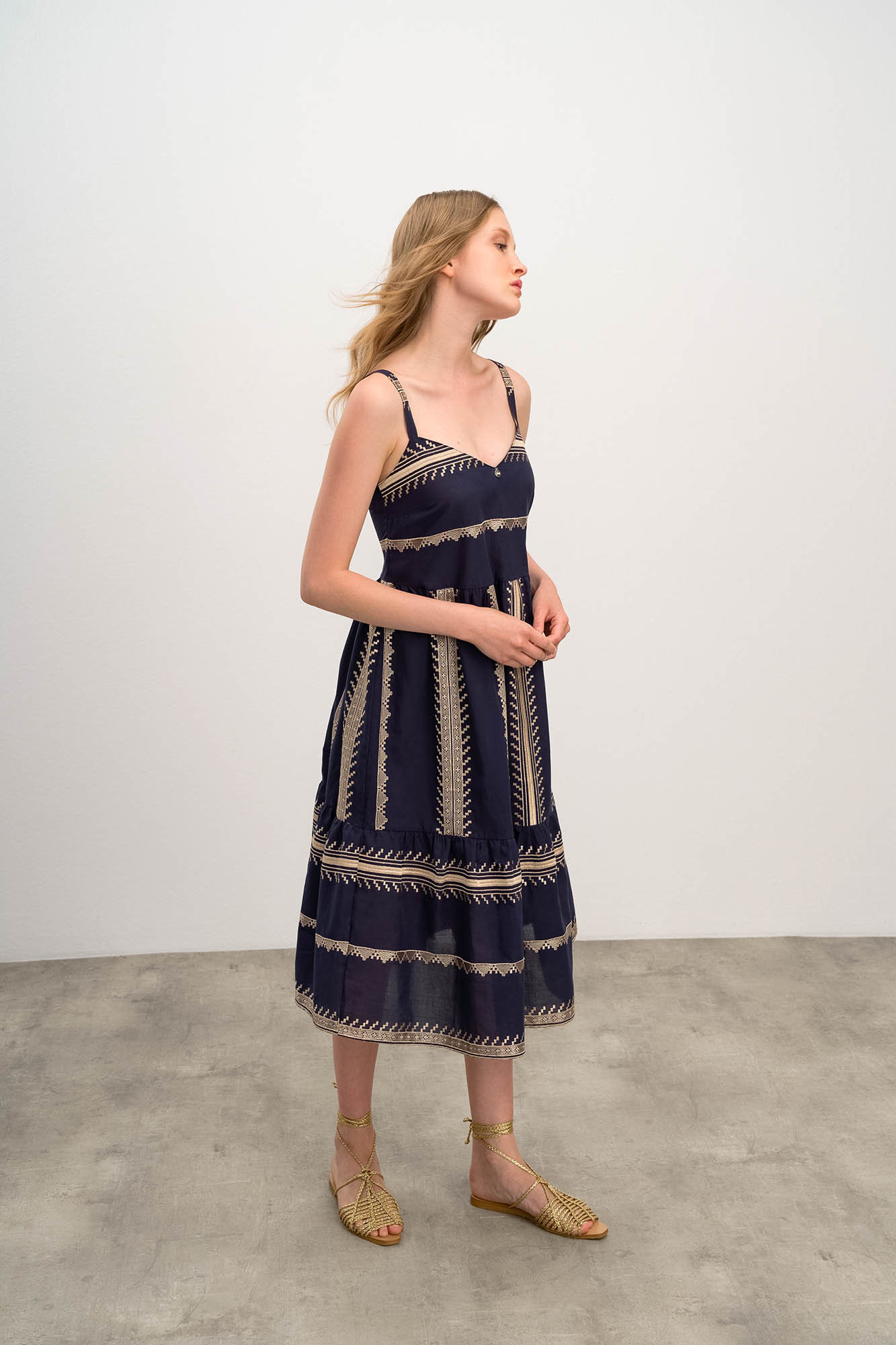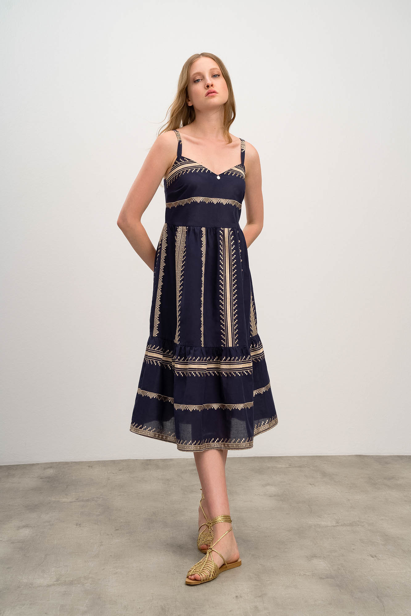 Elegantní tmavěmodré dámské šaty na ramínka se zlatou vyšívkou a výstřihem do V. Šaty jsou vyrobené z velmi lehké bavlněné látky Voile, která je mimořádně jemná na dotek a příjemně chladivá. Ideální pro teplé letní dny.