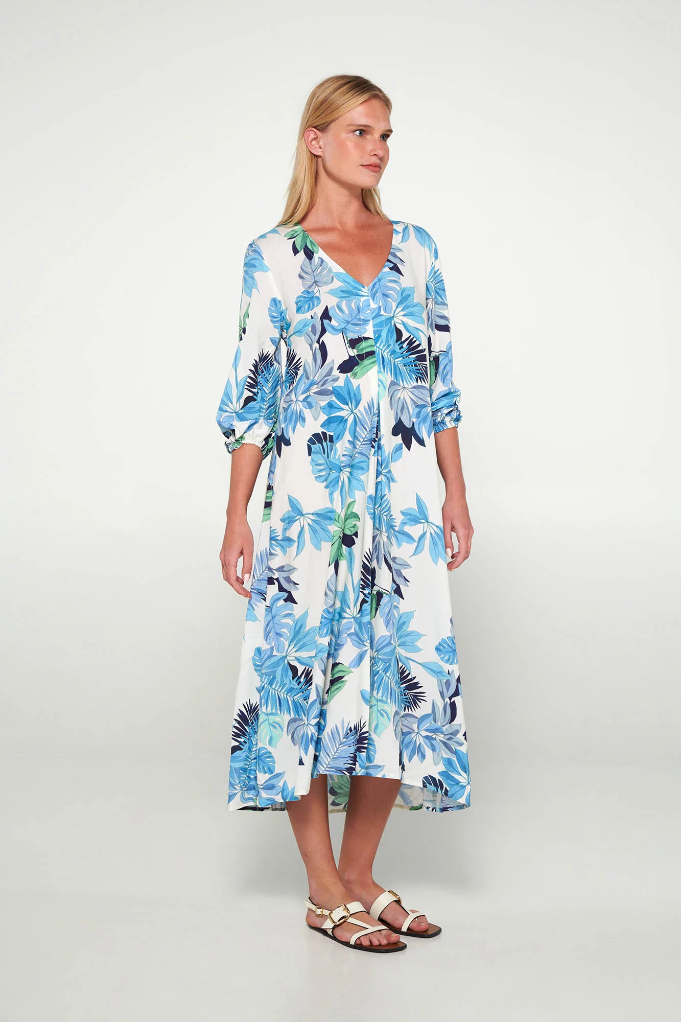 Dlouhý kaftan s krátkými rukávy, výstřihem do V a záhyby pro větší pohodlí. Krásný, zářivý květinový vzor, který můžete nosit celé léto.