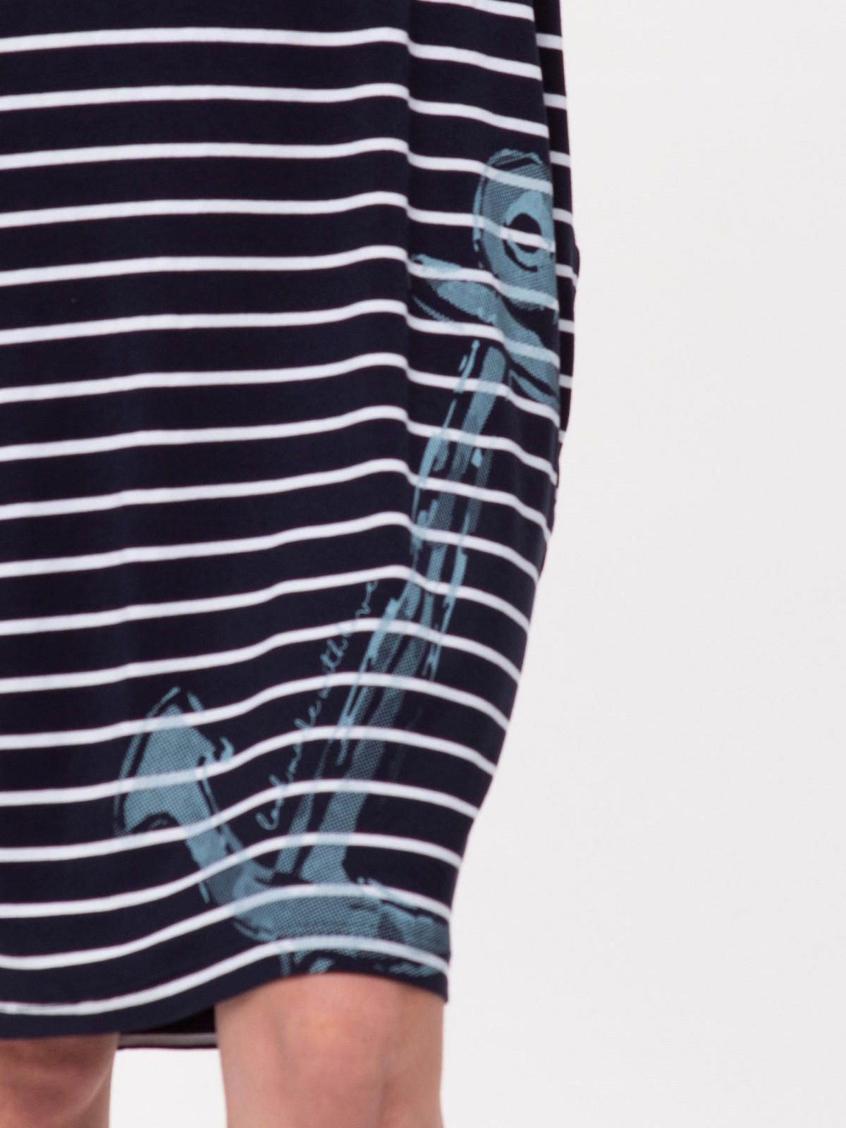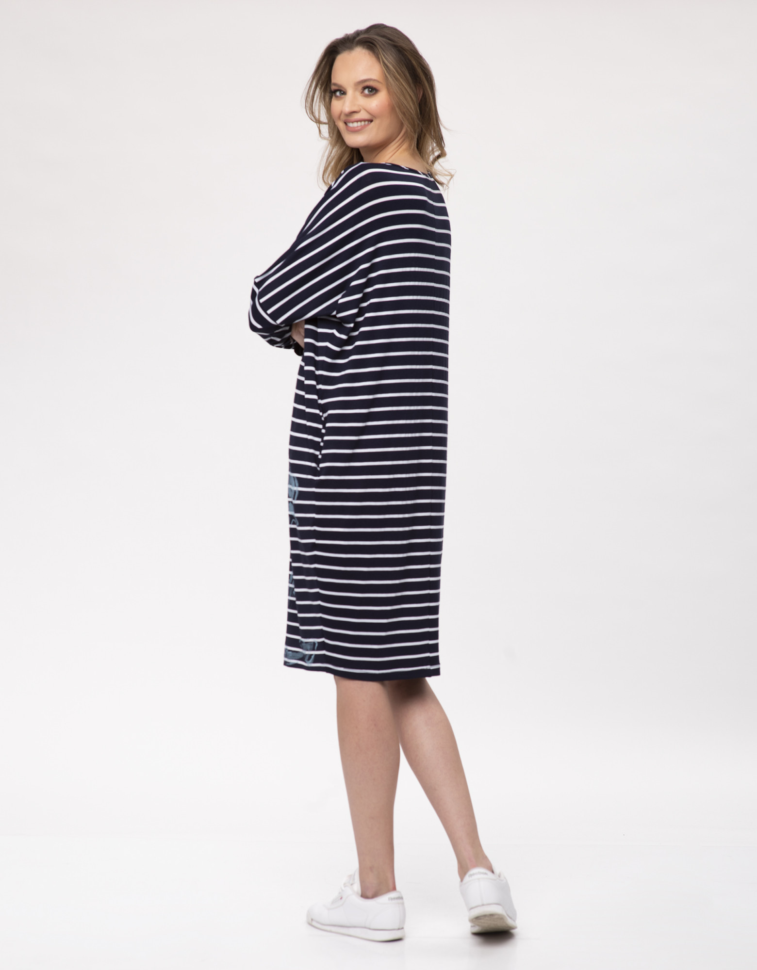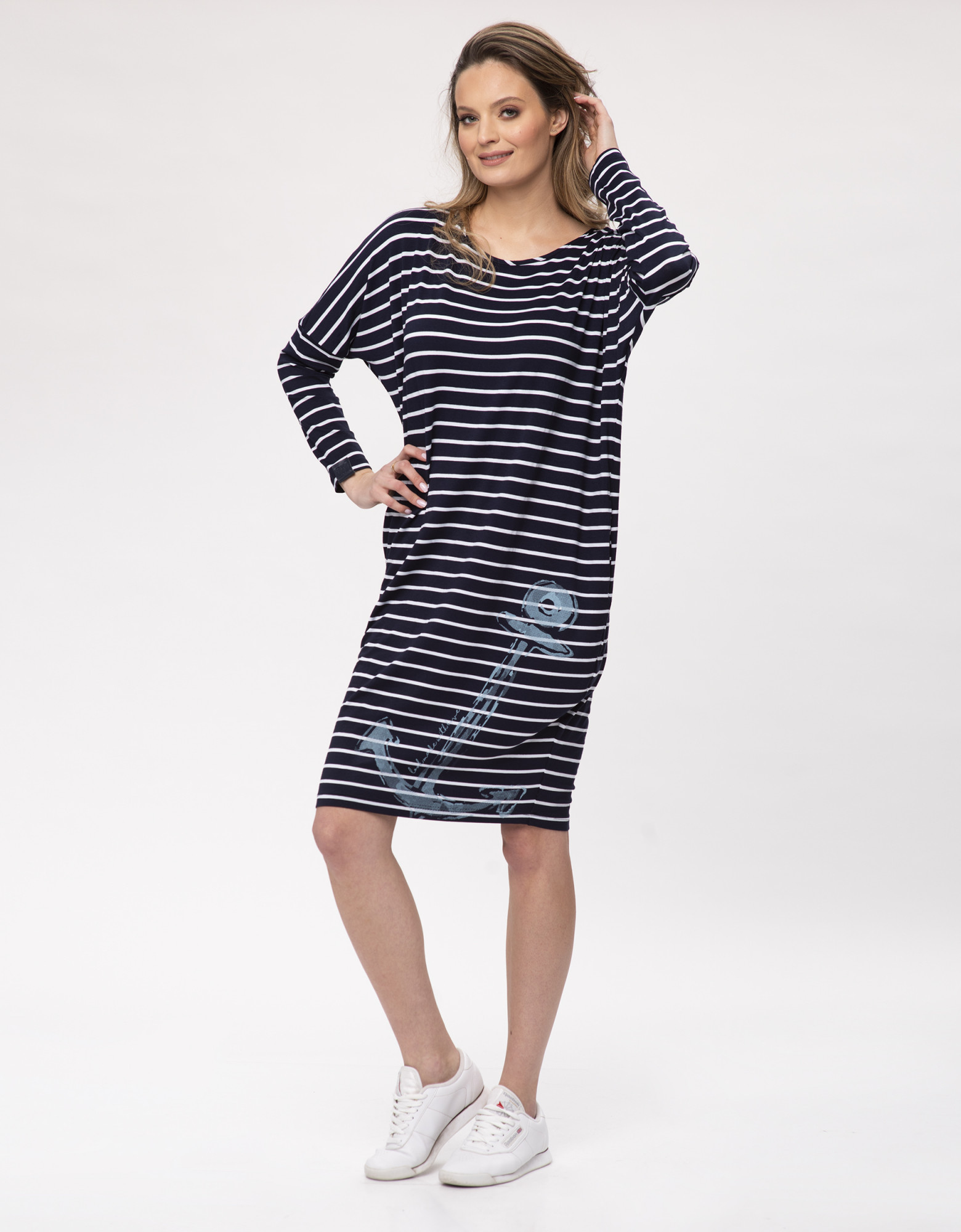 Dokonalý model oversize šatů s kapsami. Volný tvar trubky s kimonovým rukávem nám poskytuje pohodlí a volnost pohybu. Můžete ho libovolně kombinovat s mnoha doplňky a snadno tak získat jarní a letní námořnický outfit. Vyrobeno z viskózového úpletu, vysoce elastické, s tmavě modrými a bílými pruhy. Zdobí ho asymetricky vynikající malířský potisk ve tvaru nedokončené kotvy, který nám dodává tesknou prázdninovou atmosféru a zlepšuje náladu.