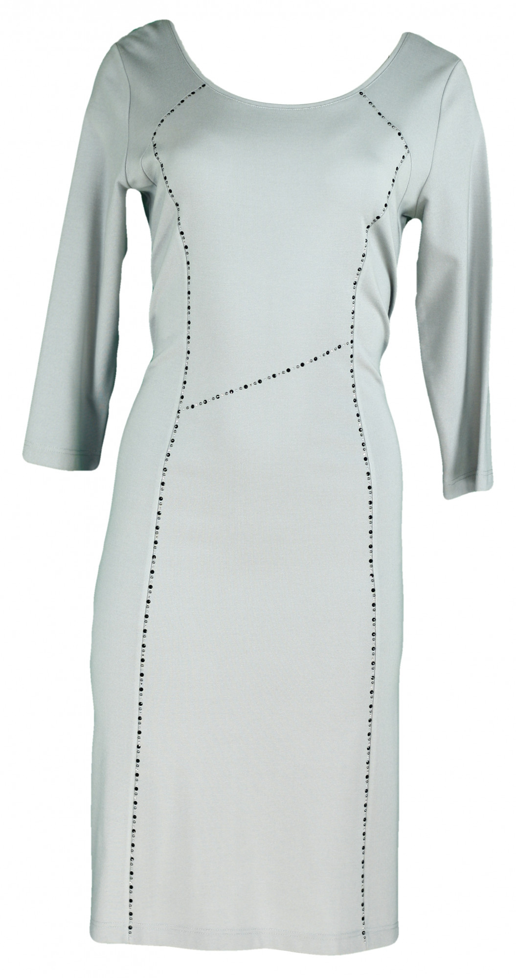 Dámské šaty BARA ŠA T 3/4 - Favab. Praktické, slušivé šaty s 3/4 rukávy, v délce pod kolena, opticky zeštíhlulící střih, podtrhující ženské tvary, zdobené Swarovského krystaly, v černé a stříbrné barvě. Materiál: 63% viskóza, 31% polyamid, 6% elastan.