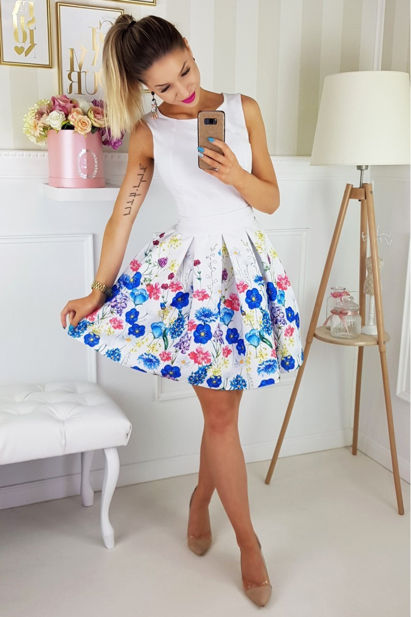 Exkluzivní společenské dámské šaty. Tento model šatů je bez rukávů s kulatým výstřihem. Přední část v oblasti dekoltu je tvořena jako dvouvrstvá, první vrstvu tvoří neprůhledný mateial, druhý vrstva je jemná síťovina pošitá ornamenty. Sukénka je krásně vzdušná, skládaná a květinová, podšívku tvoří tyl. Sukně má i kapsy. Součástí je i pásek, který si můžete libovolně zavázat. Zapínání je řešeno v zadní partii všitým zipem. Obléct si tyto šaty můžete na společenské události, jako jsou plesy, návštěvy divadla a podobně orientované události. Oblečte si je zkrátka tam, kde chcete být vidět.
