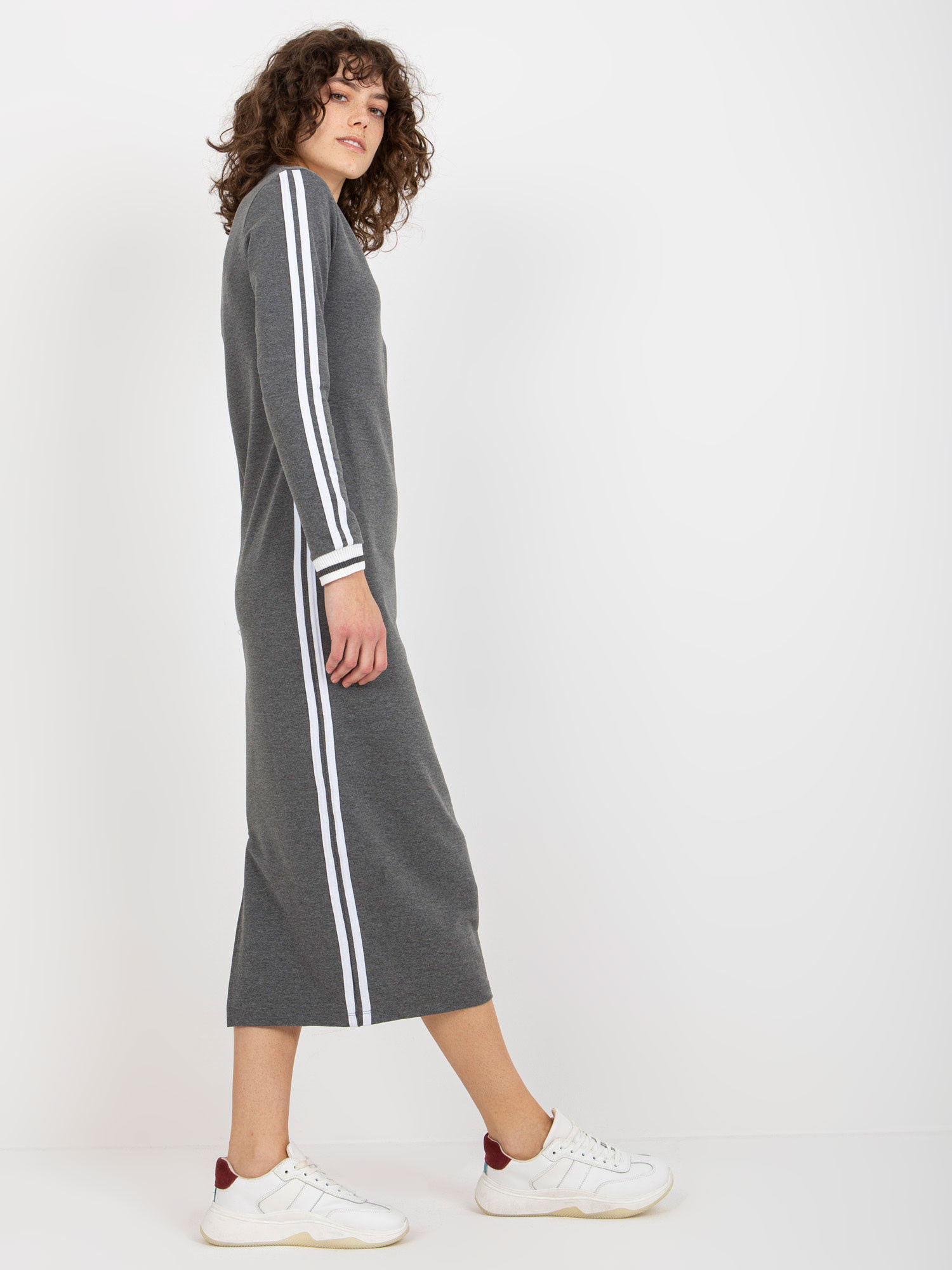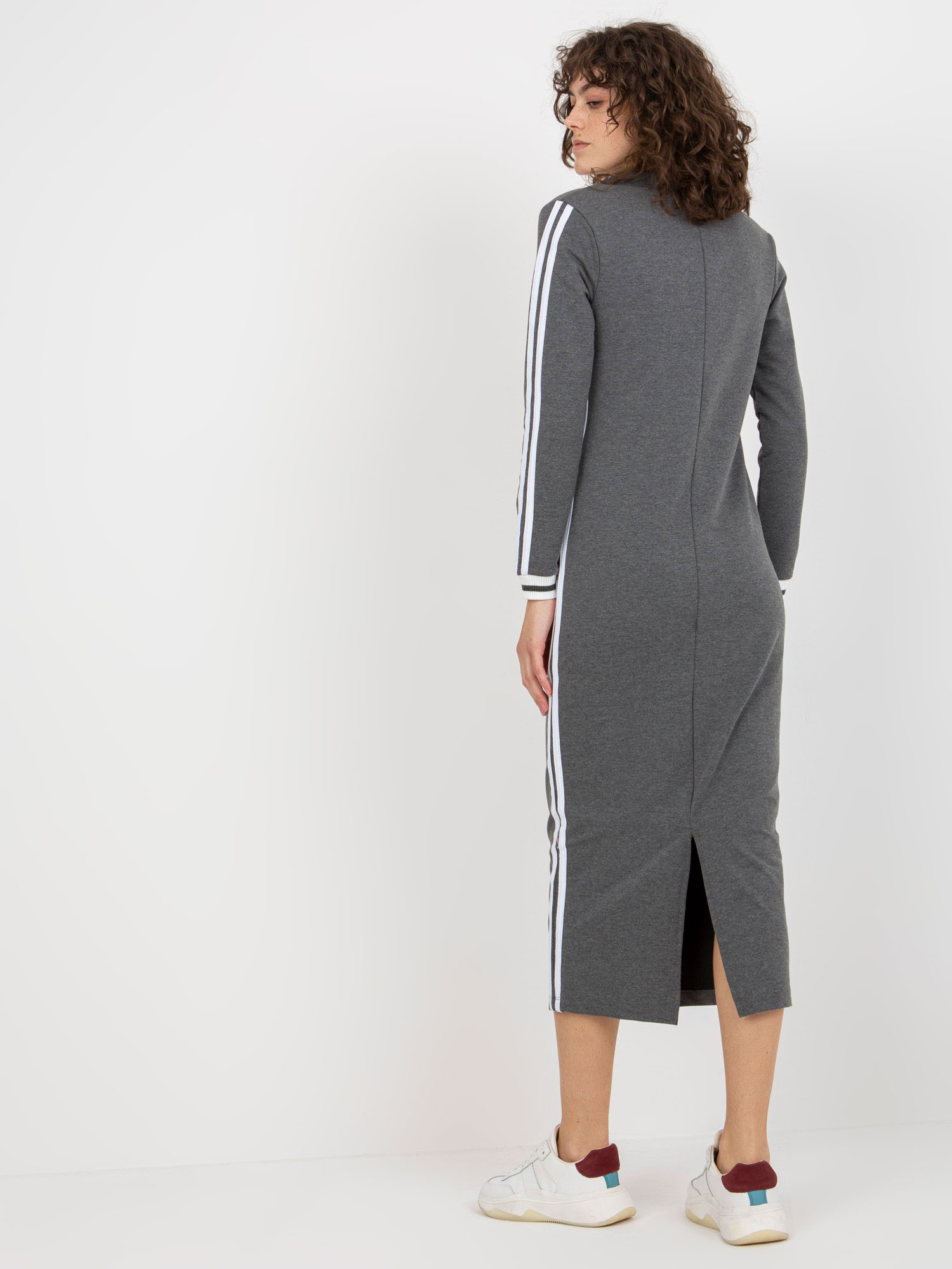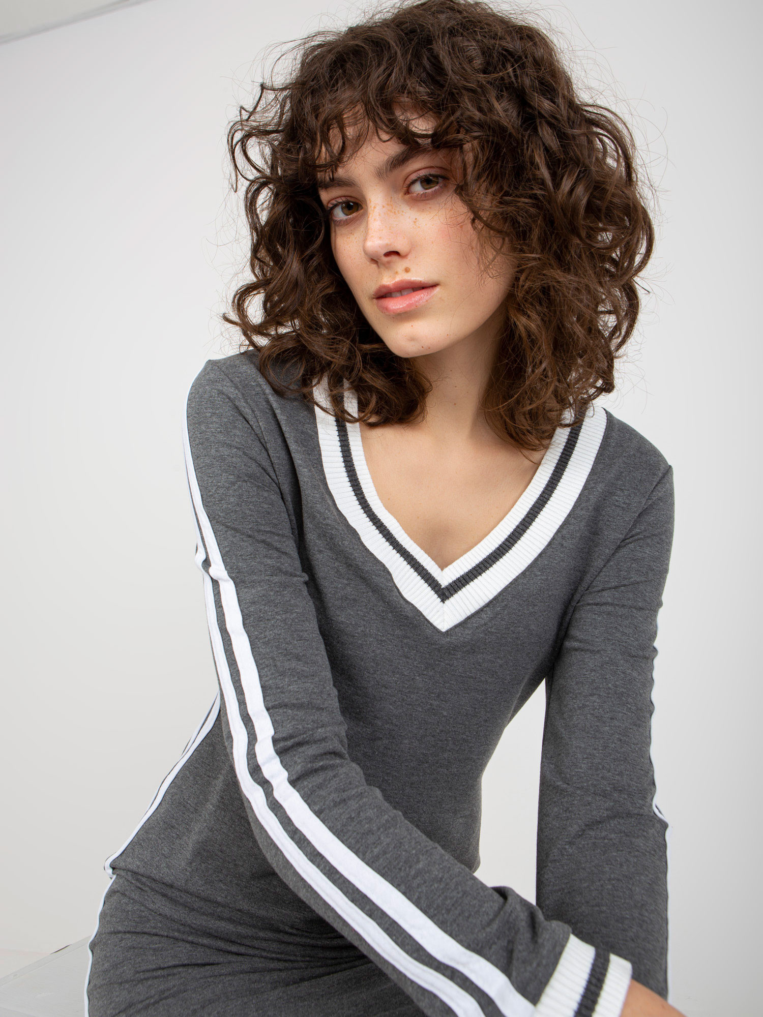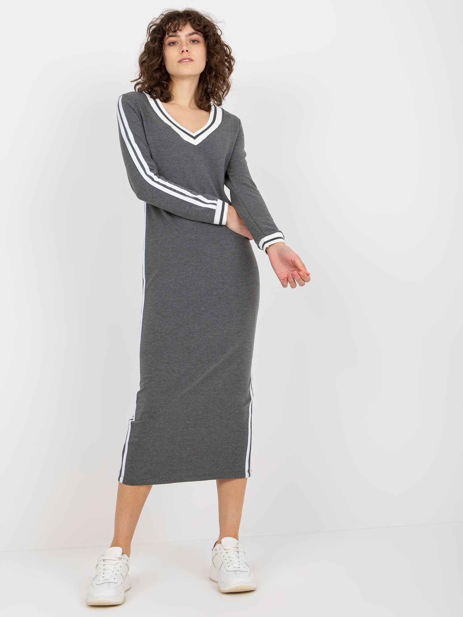 Tmavě šedé midi teplákové šaty s výstřihem do V .