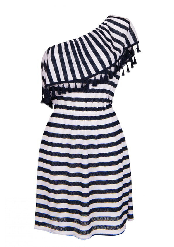 Módní a rozpustilé šatičky, které jsou obzvláště svůdné díky tomu, že se nosí jen na jednom rameni. Okouzlíte v nich jak na pláži, tak i při vyřizování každodenních povinností. Mimořádnou pozornost přilákají hravé proužky a roztomilé bambulky, které spojují námořnický styl s etno vzhledem. Svůdnou siluetu ženské postavy podtrhne guma v pase, která vám zajistí i pohodlné a lehké nošení.