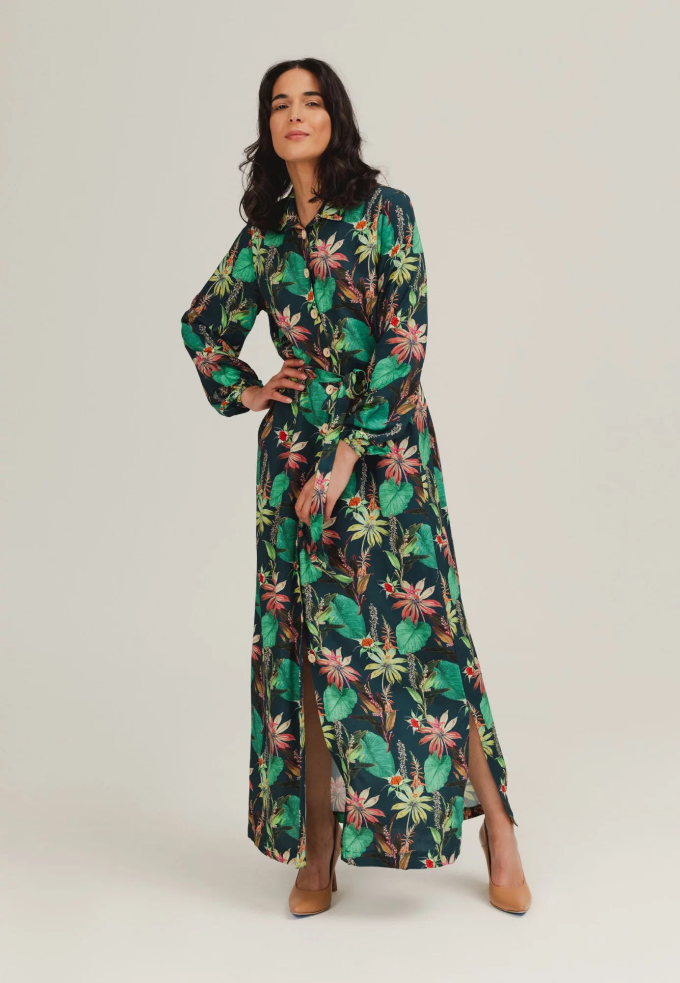Helen je: jedinečné maxi šaty, které si zamilujete od prvního nošení. Má dlouhé rukávy zakončené gumičkou, kapsy a dva rozparky na bocích. Vpředu jsou po celé délce šatů knoflíky, které můžete libovolně rozepnout a vytvořit tak hlubší výstřih nebo další otvor ve spodní části. Má také přídavný materiálový pásek a všitá poutka. Vrchní část šatů je zakončena vyztuženým límcem.