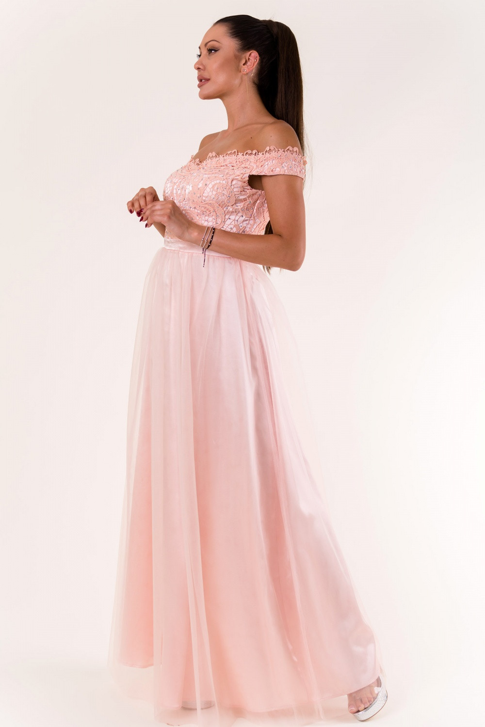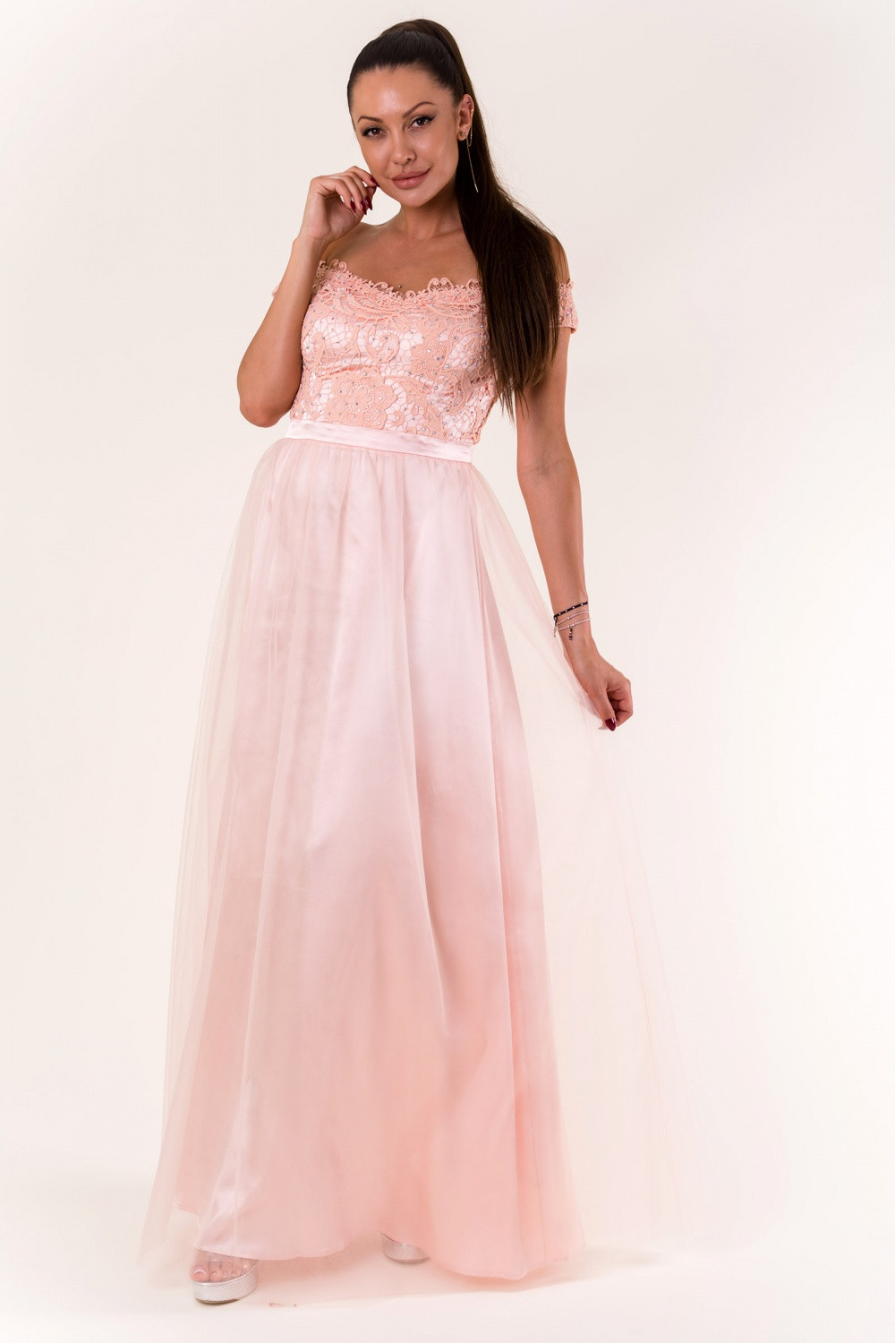Dlouhé večerní šaty s odhalenými rameny. Šaty jsou v pase přestřižené, dole rozšířené. Horní část zdobená zajímavou výšivkou. Skvěle se hodí pro mnoho příležitostí.