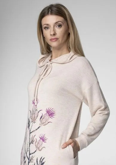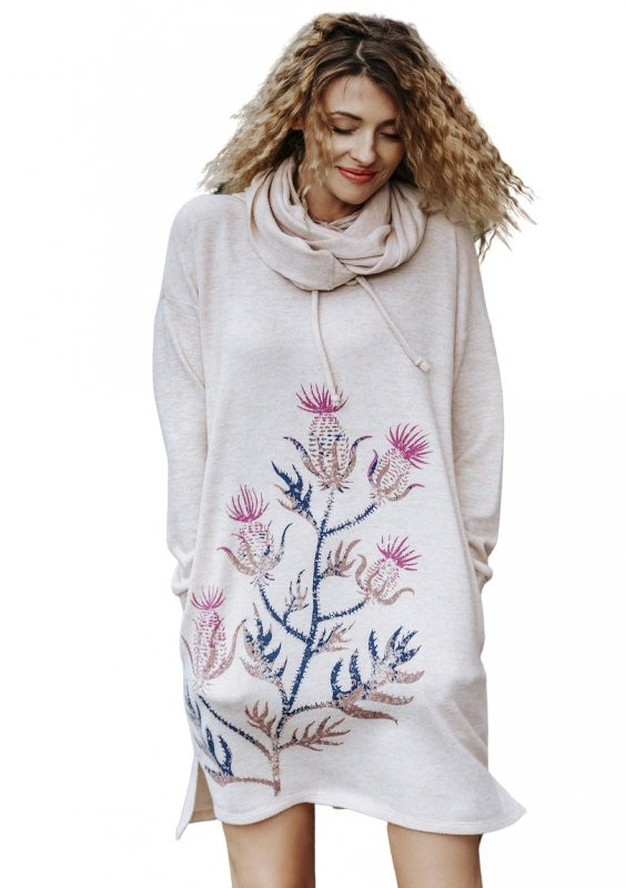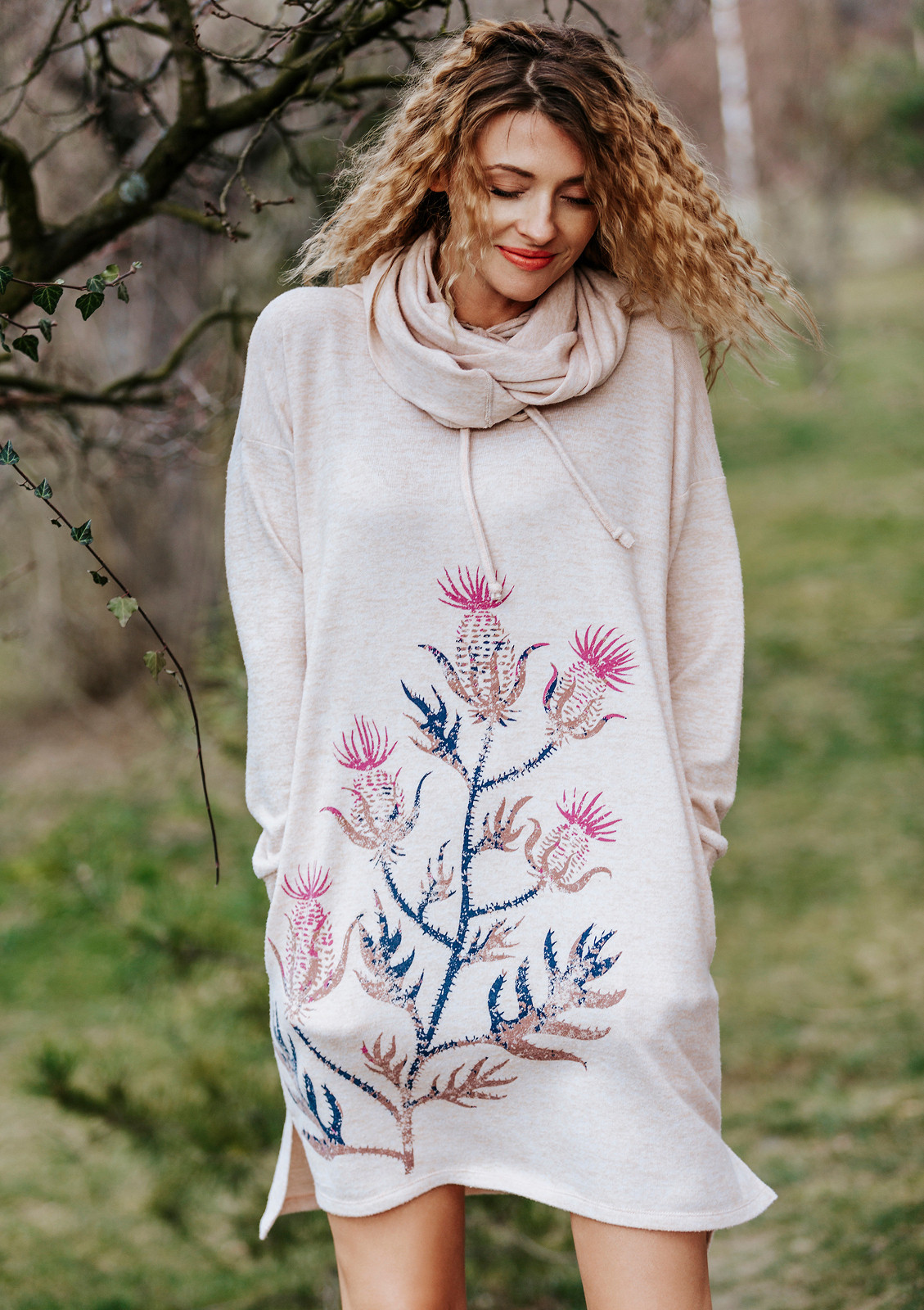 Košile má kapuci se stahujícími šňůrkami. Přední díl košile je ozdobený potiskem s rostlinným motivem. Model má módně prodloužený zadní díl. Na úrovni boků jsou pohodlné kapsy.