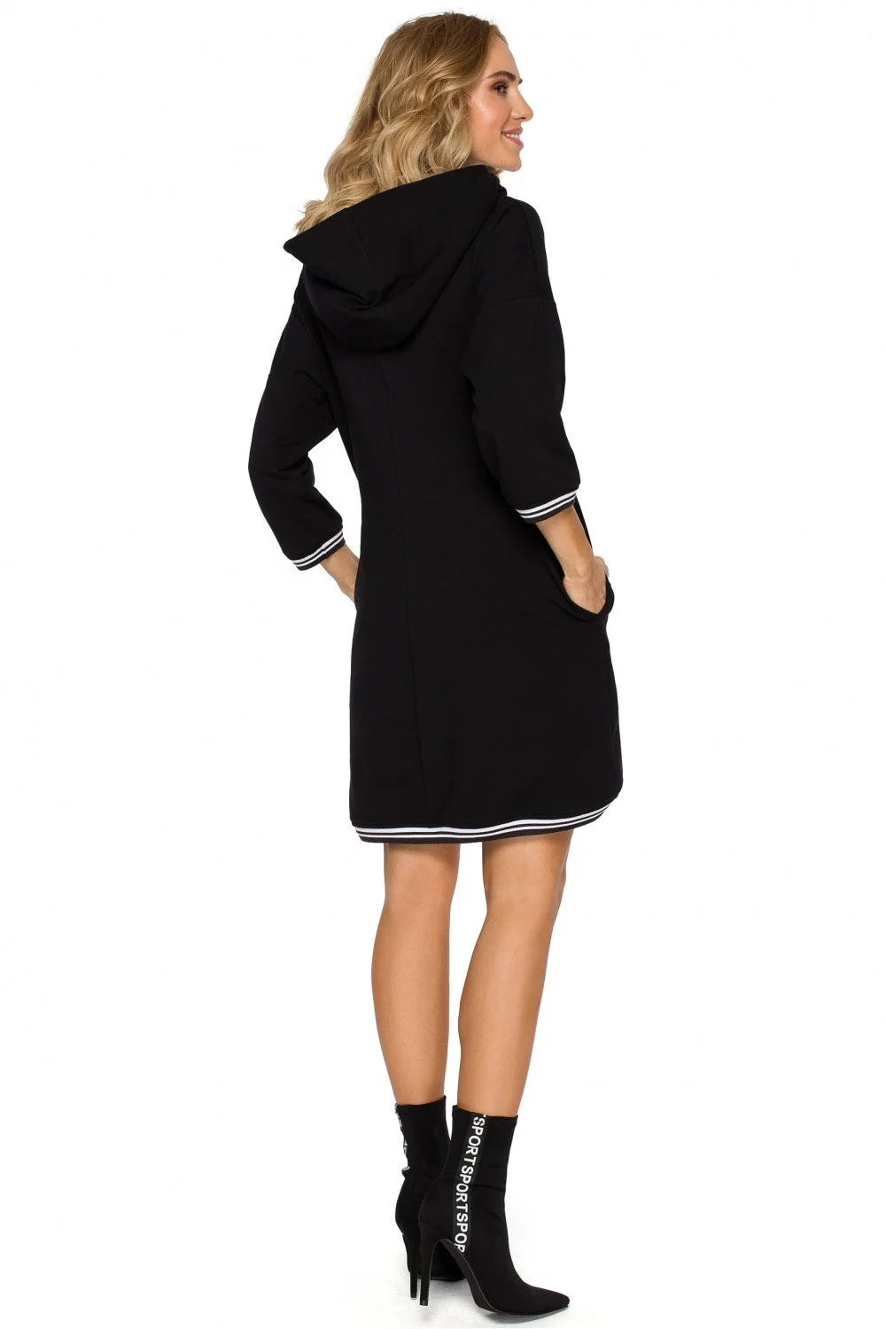 Univerzální a praktická tunika, mikina nebo mini šaty s žebrovaným lemem ve stejné barvě, velkou kapucí a kapsami.