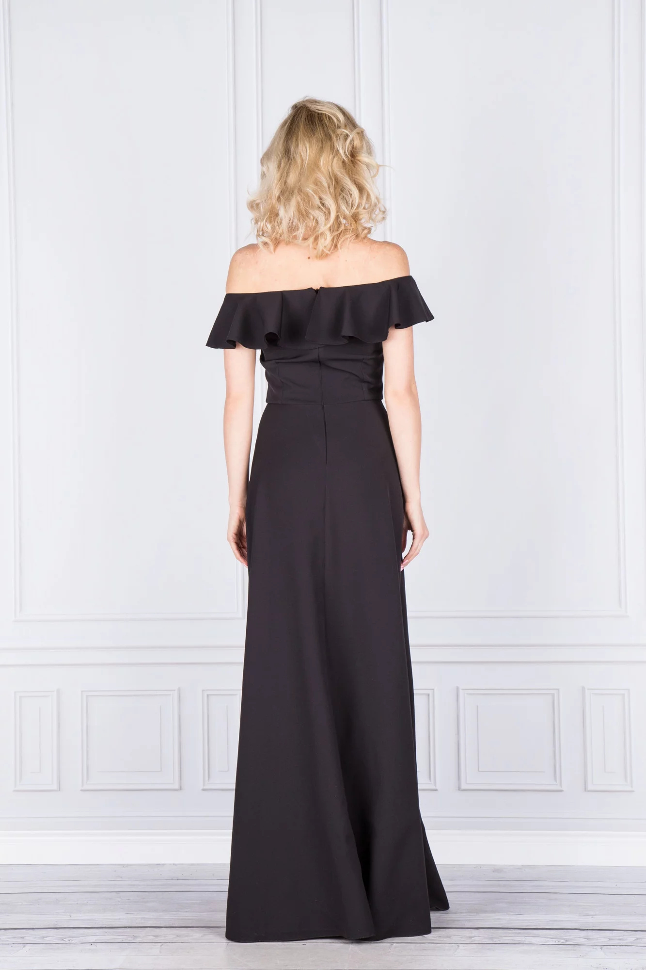 Dámske šaty z kolekcie jar / leto 2017. Vďaka dĺžke až na zem šaty vyzerajú elegantne a dôstojne. Ľahko rozšírená spodná časť je ozdobená hlbokým rozparkom, ktorý odhaľuje nohy. Vypasovaný vrch má výstrih v španielskom štýle. Modelka na obrázku meria 172 cm a predvádza model vo veľ. 36 Polyester