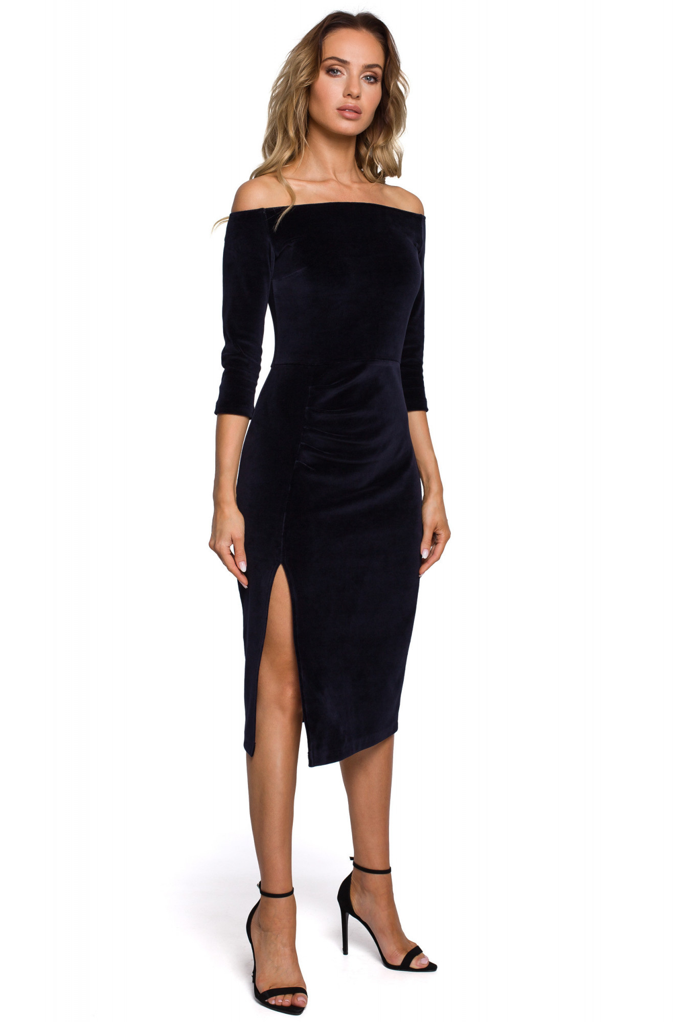 Šaty se smyslným výstřihem decentně odhalujícím ramena a vypasovaným spodním dílem s vyzývavým rozparkem na nohou. Velurový materiál potěší a upoutá pozornost. Ideální pro večery, kdy se chcete cítit sebevědomě. Šaty jsou bez podšívky.