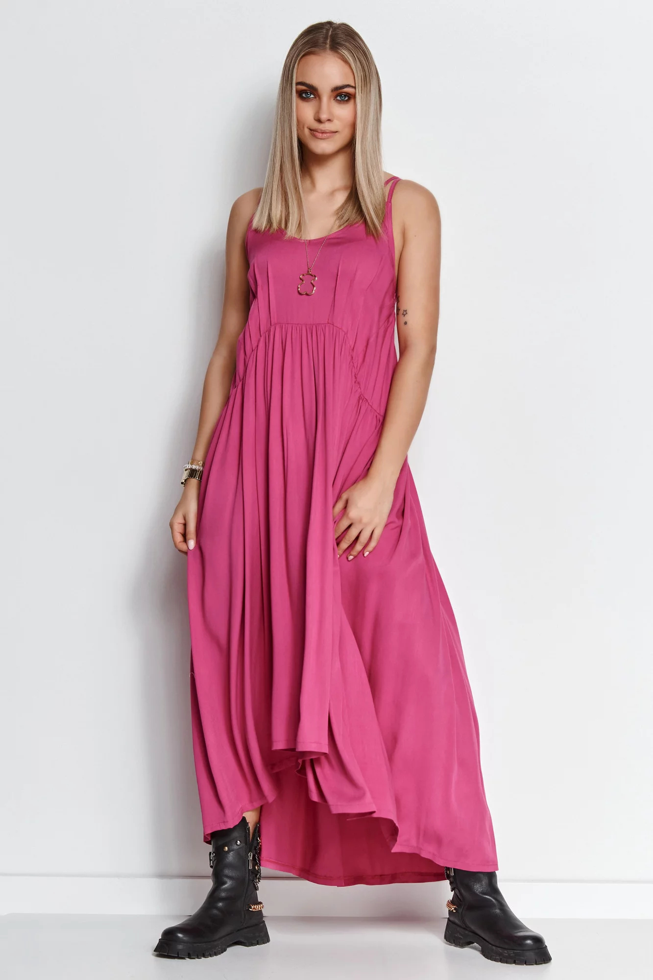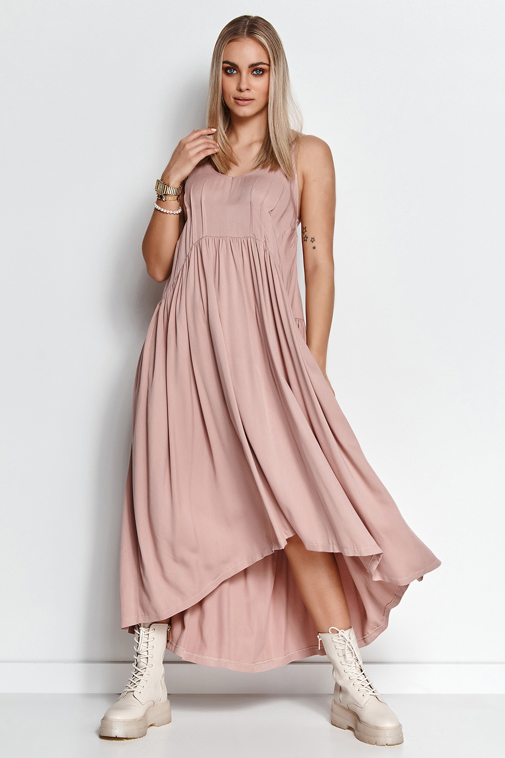 Krásné letní šaty ze vzdušné viskózy rozzáří váš den. Je lehká a vzdušná, díky čemuž vypadá při nošení krásně. Zvláště ve společnosti letního větru. Přední část je o něco kratší než zadní. V horní přední části jsou šaty zdobeny jemným řasením, které zvýrazňuje poprsí. Kromě toho má dvojité tenké ramenní popruhy. Šaty zakryjí nedokonalosti v oblasti břicha, stehen a hýždí a budete se v nich cítit velmi pohodlně. Ať už v něm strávíte pár hodin, nebo celý den. Skvěle se hodí k letním sandálům, dlouhému volnému svetru a prázdninové náladě. Zkombinujte je s elegantními jehlovými podpatky a oblíbenými perlami a během romantické večeře zazáříte.