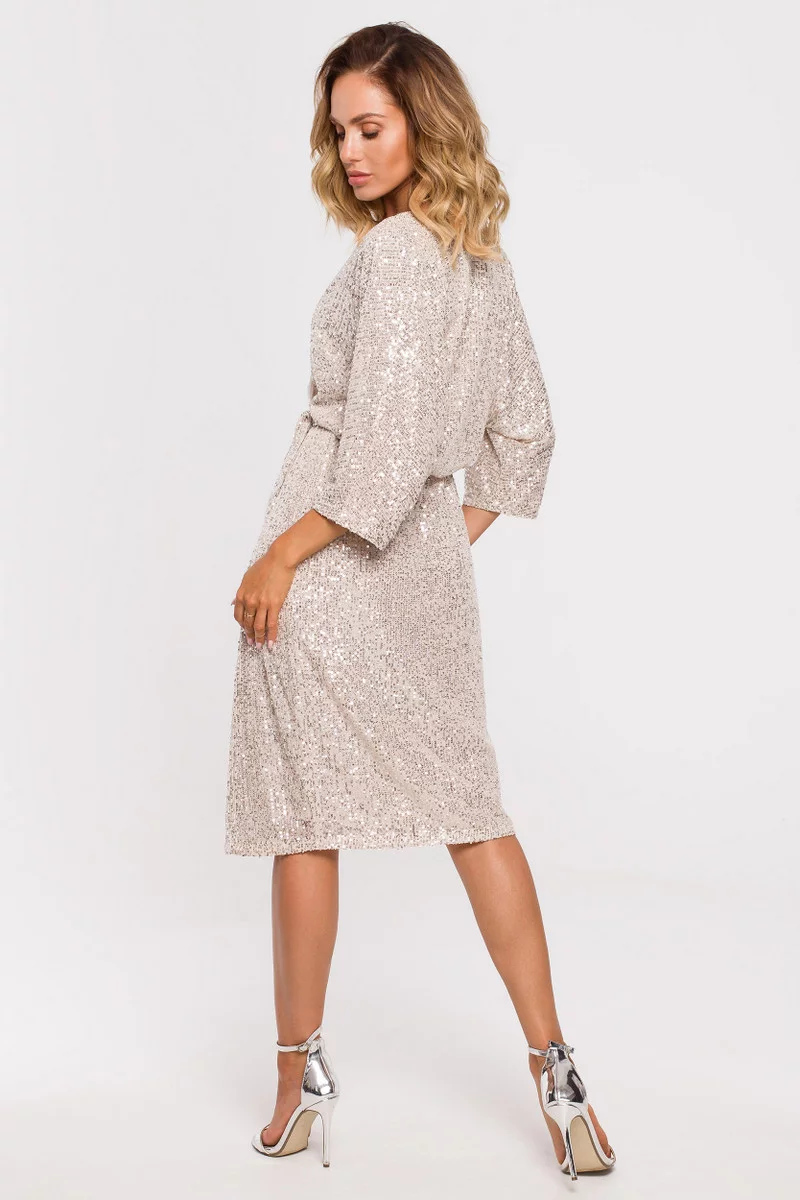 Zazáříte jako diamant! V našich flitrových šatech ve střední délce budete zářit nocí. Má úžasný véčkový výstřih, dlouhé rukávy a zavinovací design s páskem na zavázání v pase.