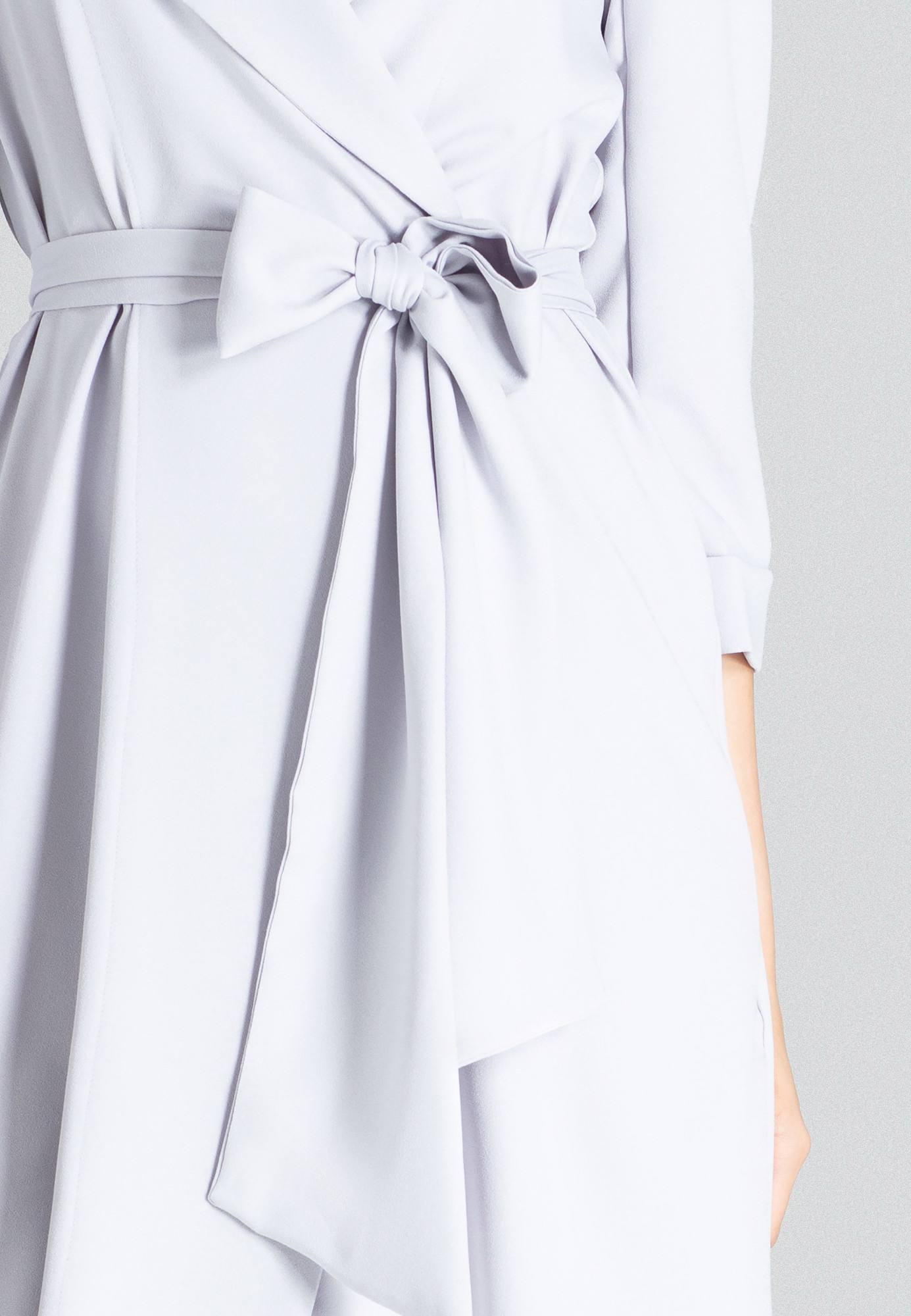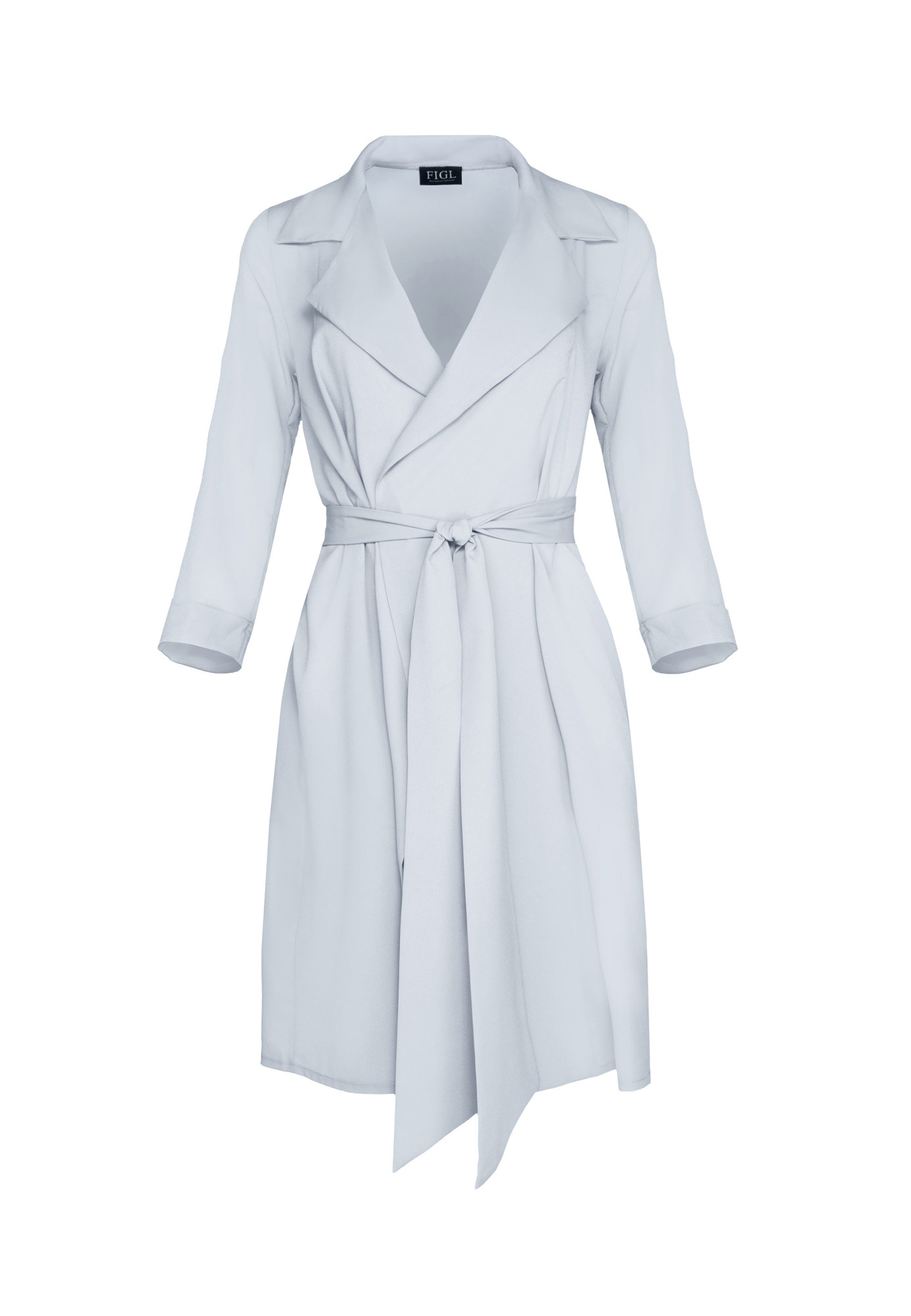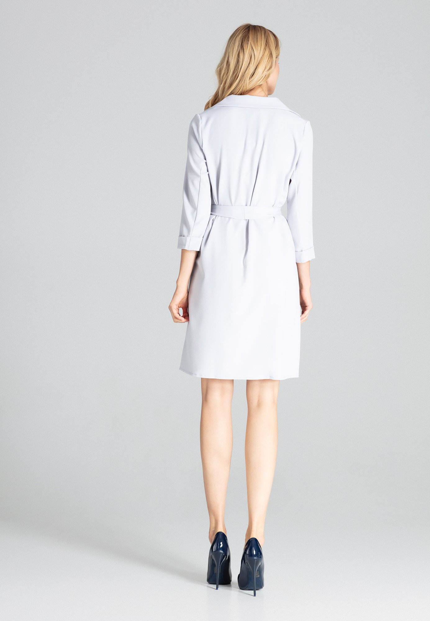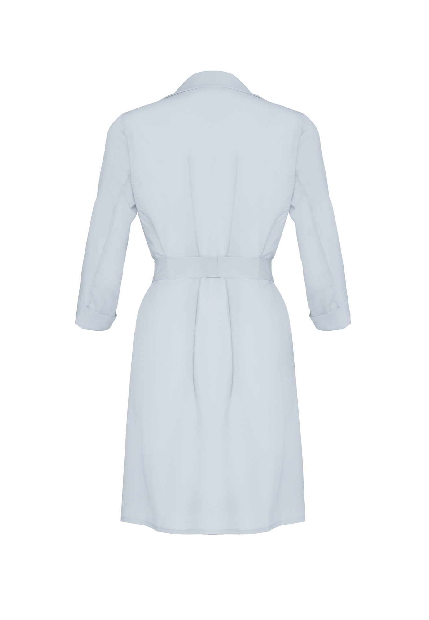 Šedé košilové midi šaty bez zapínání, zavazování v pase, s límečkem, bez kapes, bez podšívky.