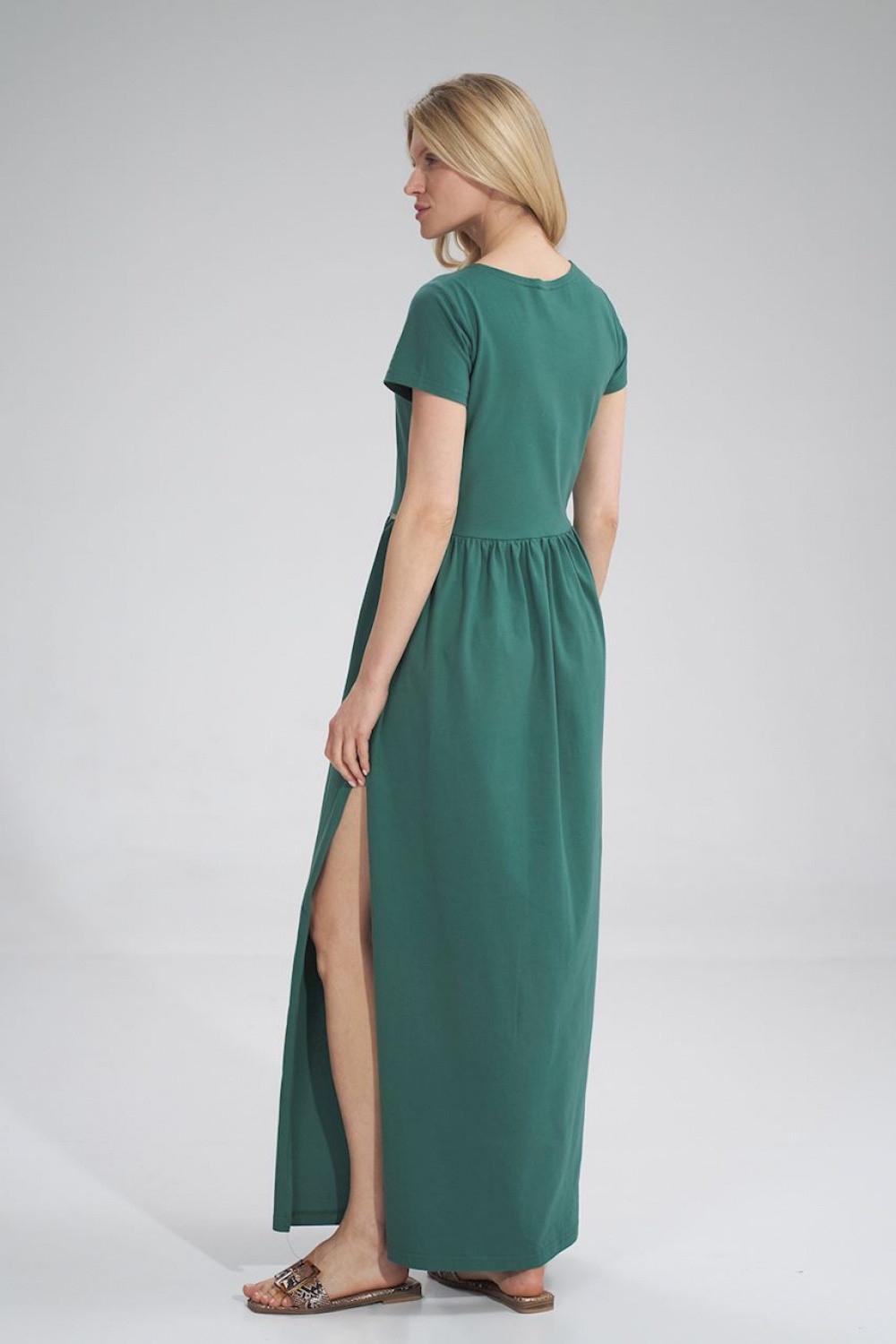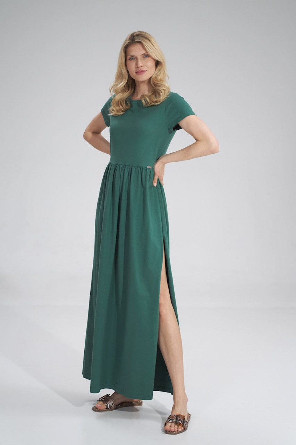 Letní bavlněné maxi šaty s půlkulatým výstřihem. Šaty s krátkými rukávy, nařasené v pase, s rozparkem na levém boku.
