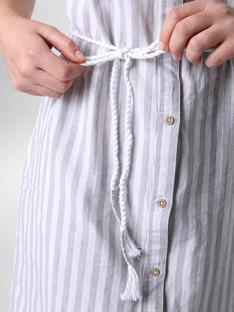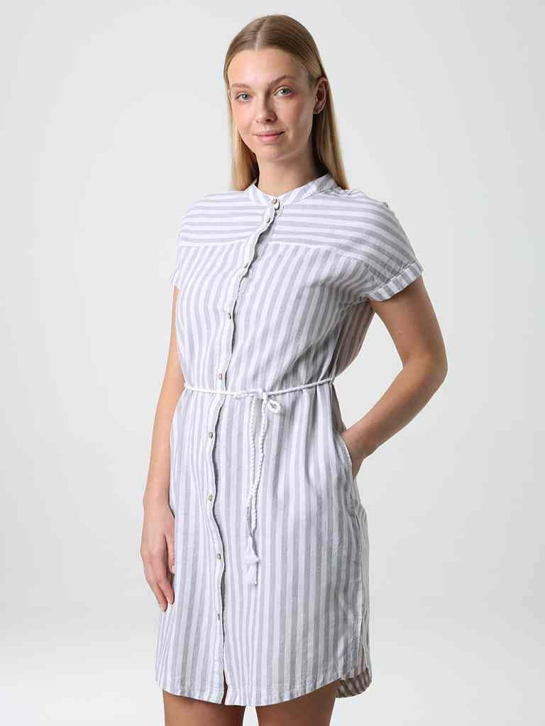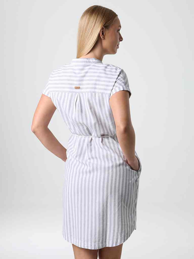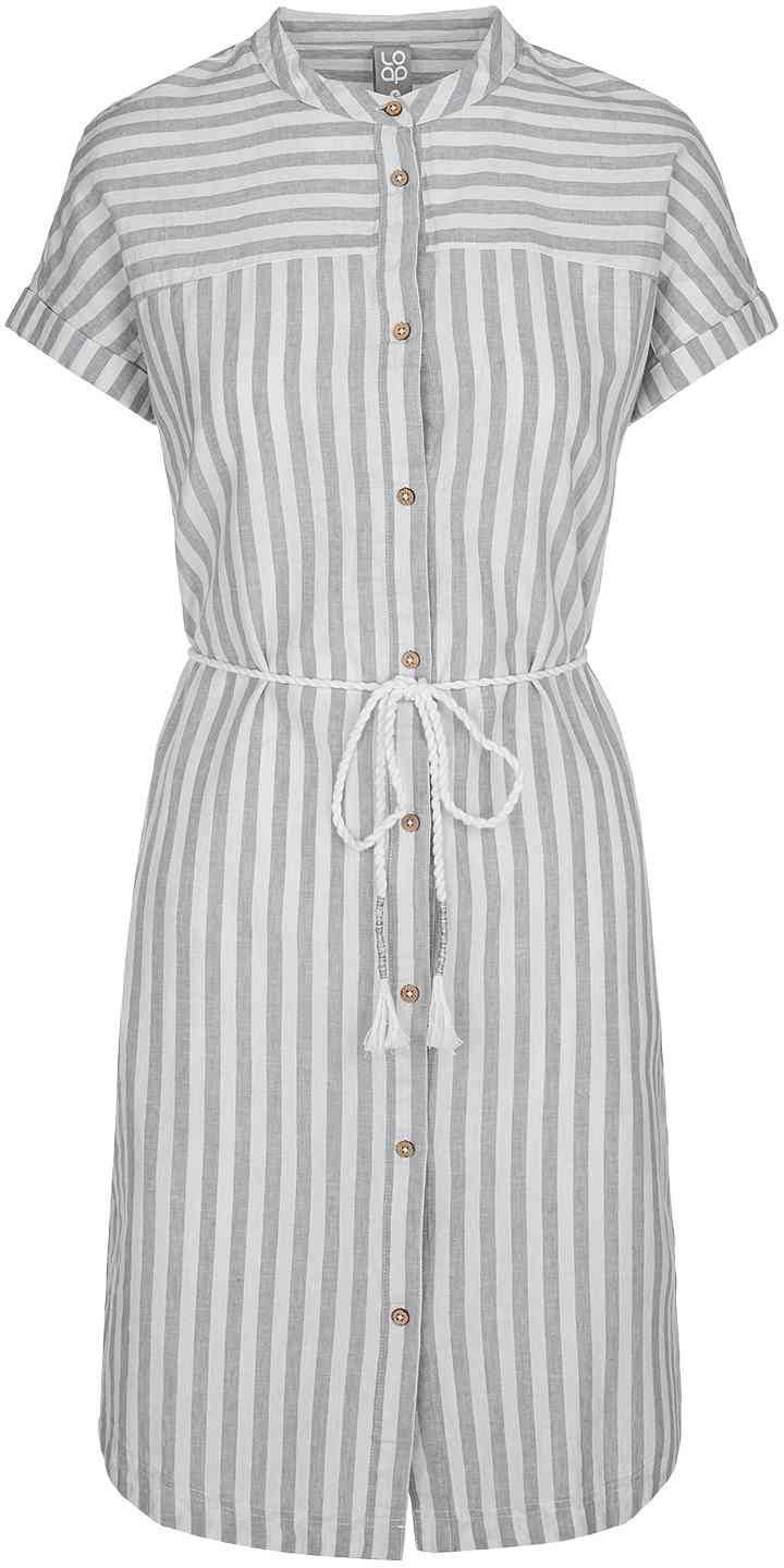Lněné dámské šaty s límečkem Loap NESHA mají po celé délce zapínání na knoflíčky a vysoký rozparek pro pohodlný krok. Stahují se páskem, ale dají se nosit i na volno bez něj. Na bocích mají dvě otevřené kapsy. Ušité jsou v klasickém střihu ze lnu a bavlny v lehké gramáži. Tyto pruhované letní šaty s minirukávkem jsou pevné, přesto prodyšné a skvěle odvádí teplo i vlhkost. Dobře drží tvar a jsou vhodné i pro alergiky, protože díky lnu šaty přitahují méně prachu a pylů. Jsou ideální na nošení do práce, na cestování i volný čas.