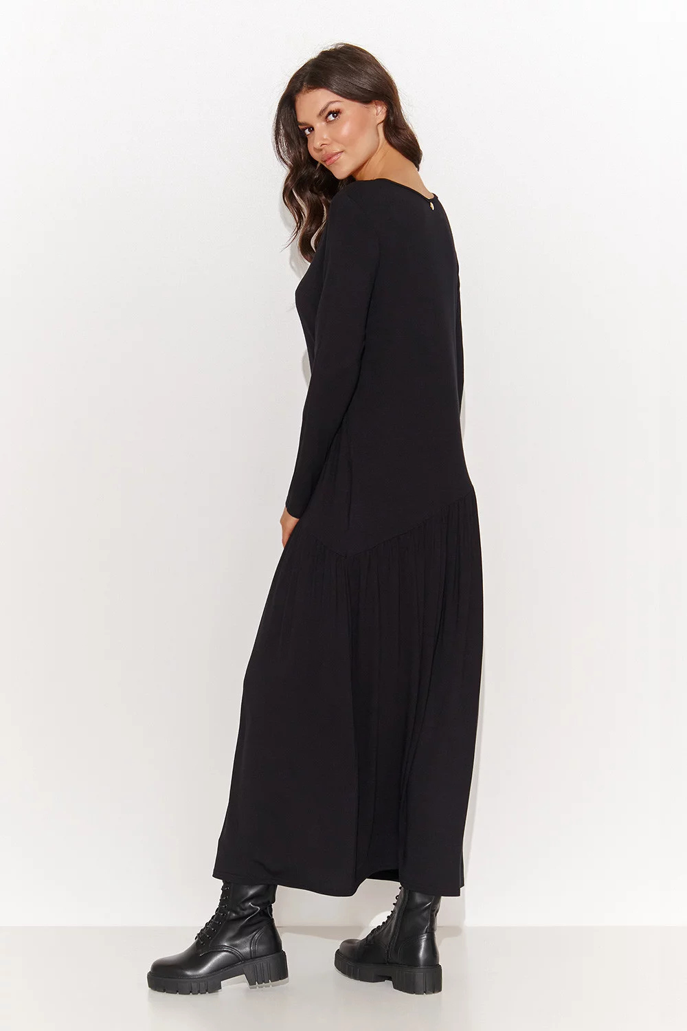 Maxi šaty ze vzdušného viskózového úpletu jsou k dispozici v grafitovém melanžovém, velbloudím, cappuccinovém, khaki a černém provedení. Šaty mají kulatý výstřih a na zádech mají všitou halenku. Na bocích jsou přítomny nakládané kapsy. Šaty mají asymetrické prošívání umístěné mírně pod pasem. Dlouhé rukávy zajišťují volnost pohybu. Senzační volba pro efektní styling do práce nebo do společnosti s přáteli. Zejména v kombinaci s vlněným kabátem.