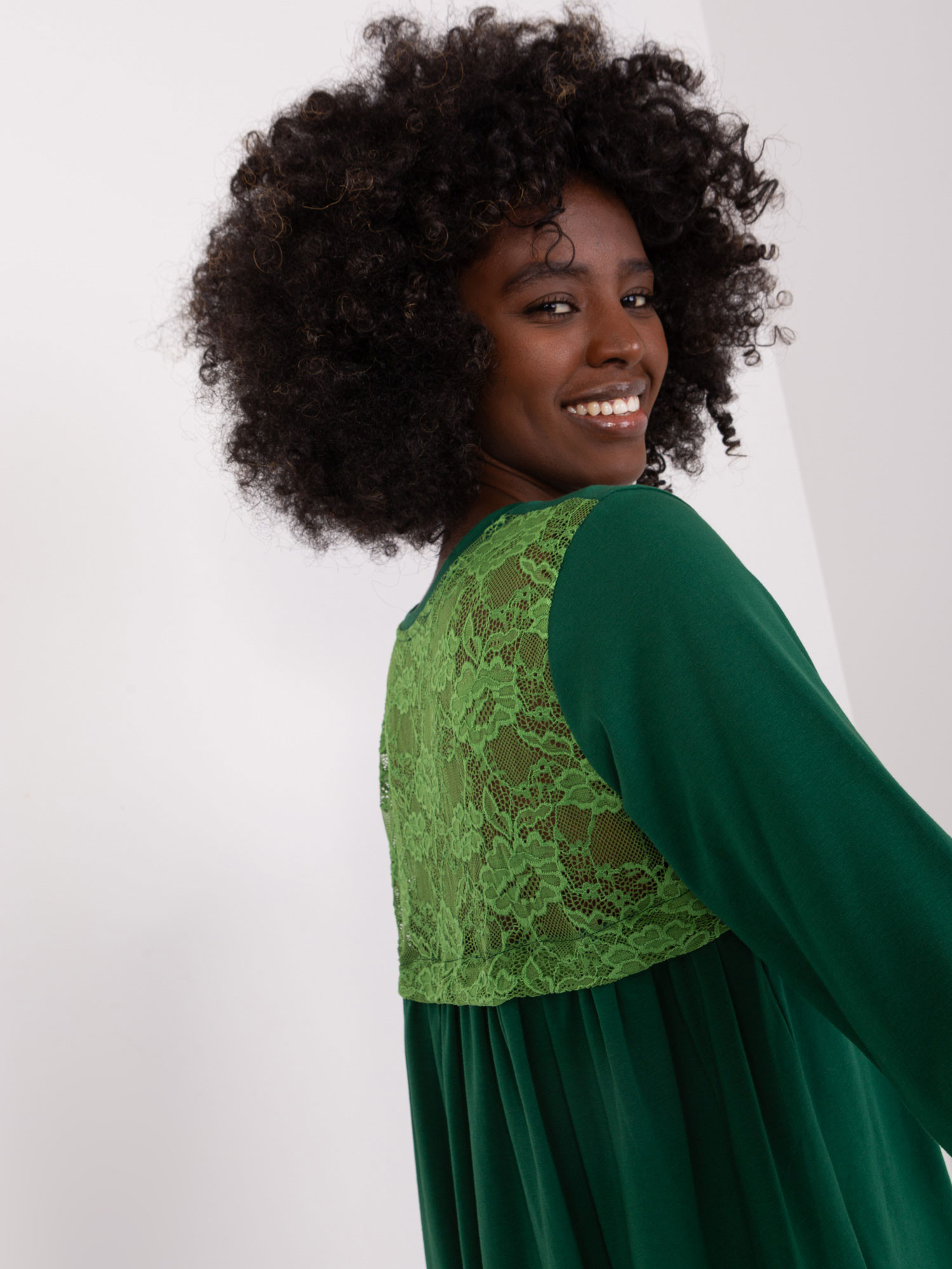 Modelka má na sobě velikost S/M. Rozměry modelky: výška 168 cm, prsa 82 cm, pas 62 cm, boky 93 cm.