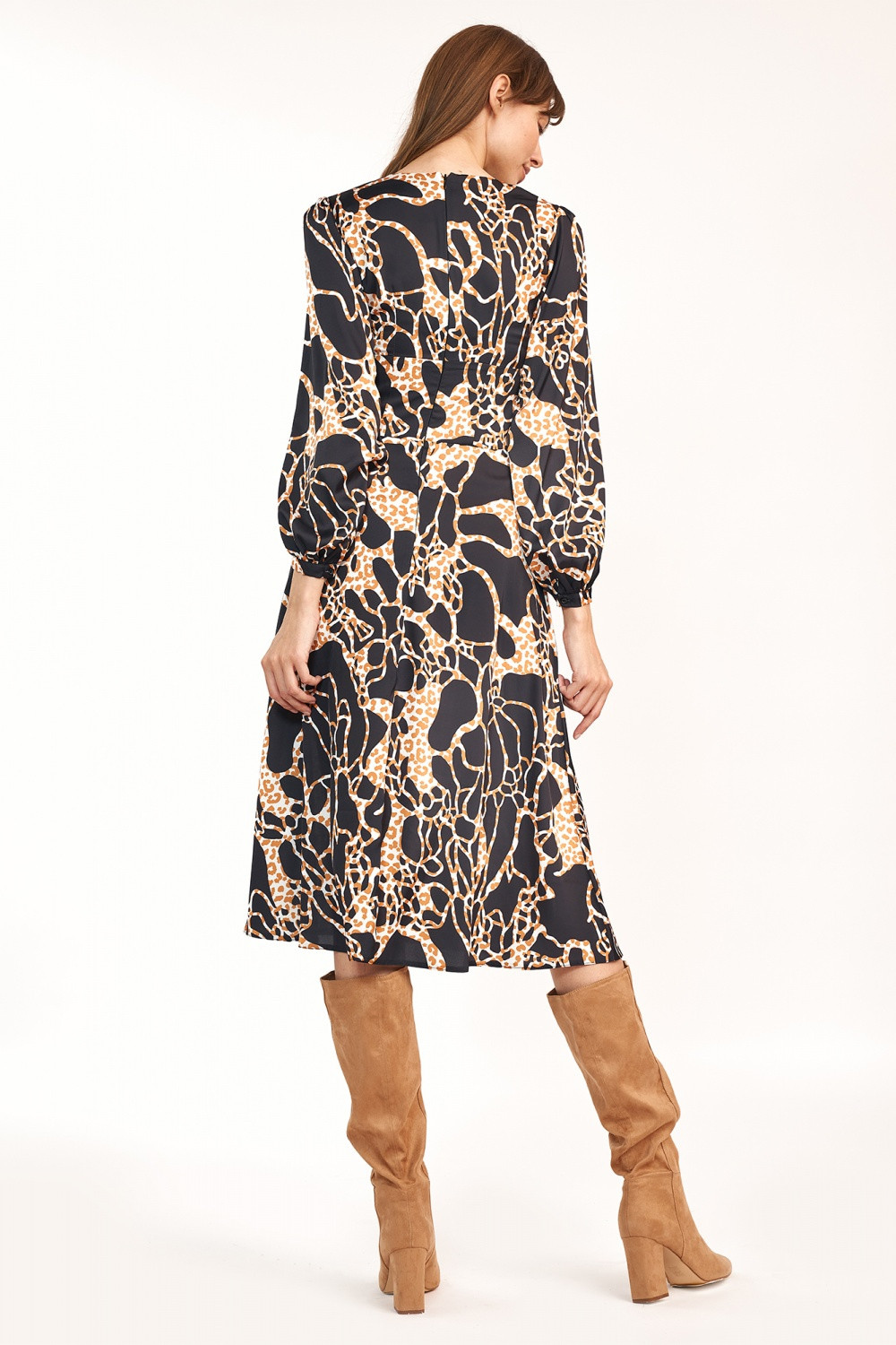Vzorované midi šaty jsou kouskem, který by měl mít v šatníku každý! Tento model je ideální pro práci i každodenní použití. Materiál se výrazně přizpůsobuje siluetě. Šaty zdůrazňují pas. Výstřih do V prodlužuje krk. Dlouhé rukávy zakončené bufetem dodávají originální vzhled. S tímto vzorem se nemusíte starat o doplňky, je to úžasná dekorace sama o sobě.