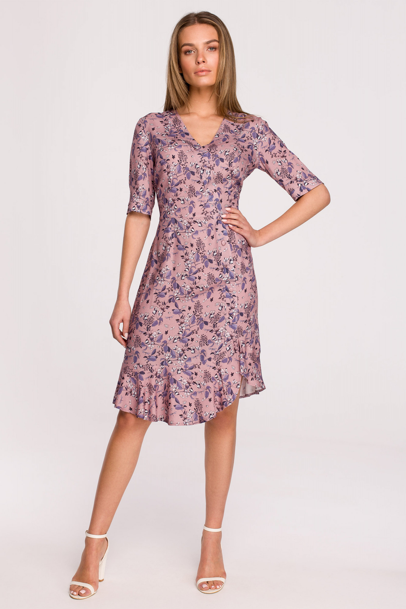 Dokonalý styl letního vzhledu. Jednoduché šaty s výstřihem a asymetrickým volánem. Krásný květinový potisk a tlumené barvy na viskóze šetrné k pokožce. Šaty jsou bez podšívky.
