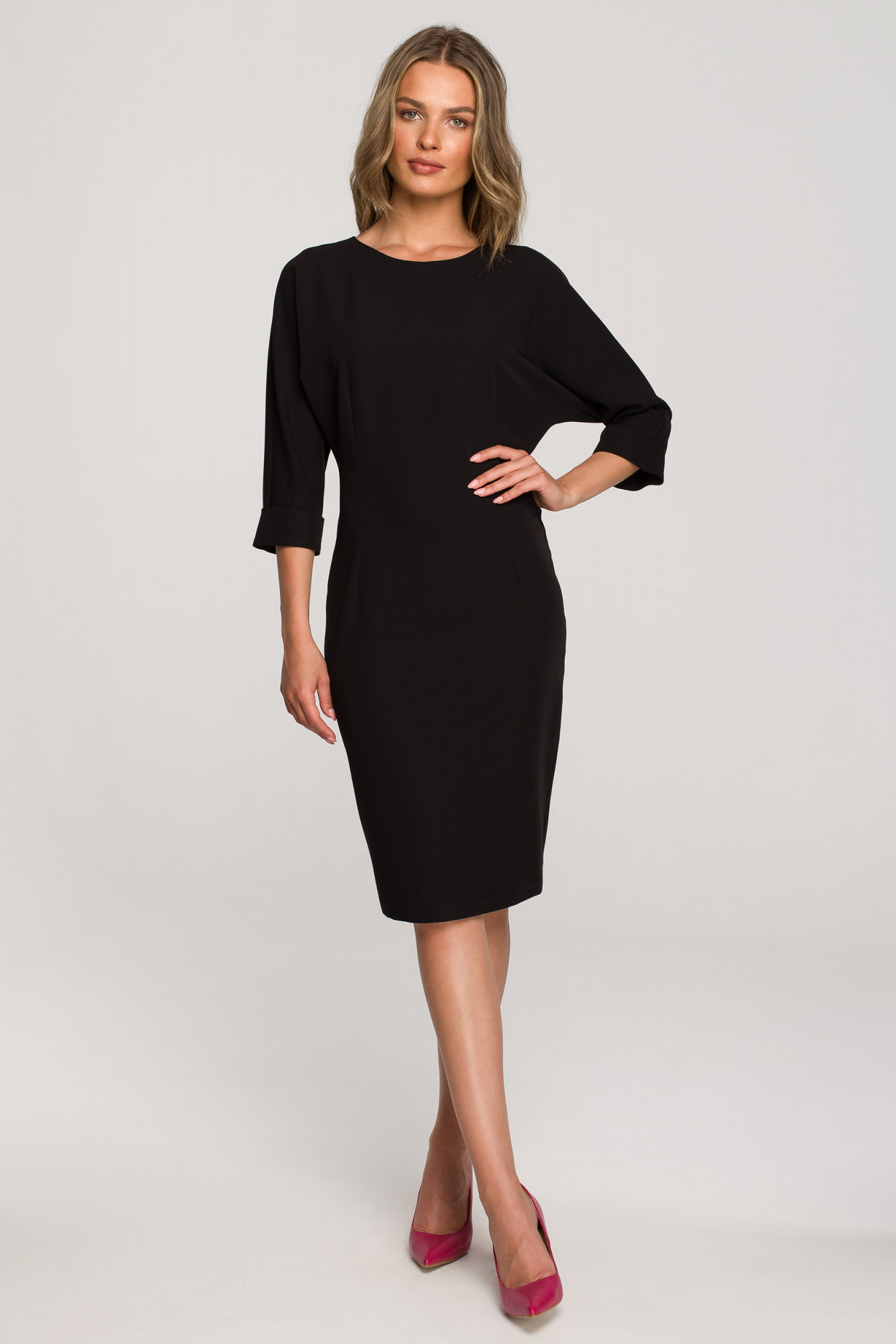 Jednoduchá tkanina a krásný tvar, který lichotí postavě - v pase stažené a s netopýřími rukávy - to jsou šaty, které si zamilujete.