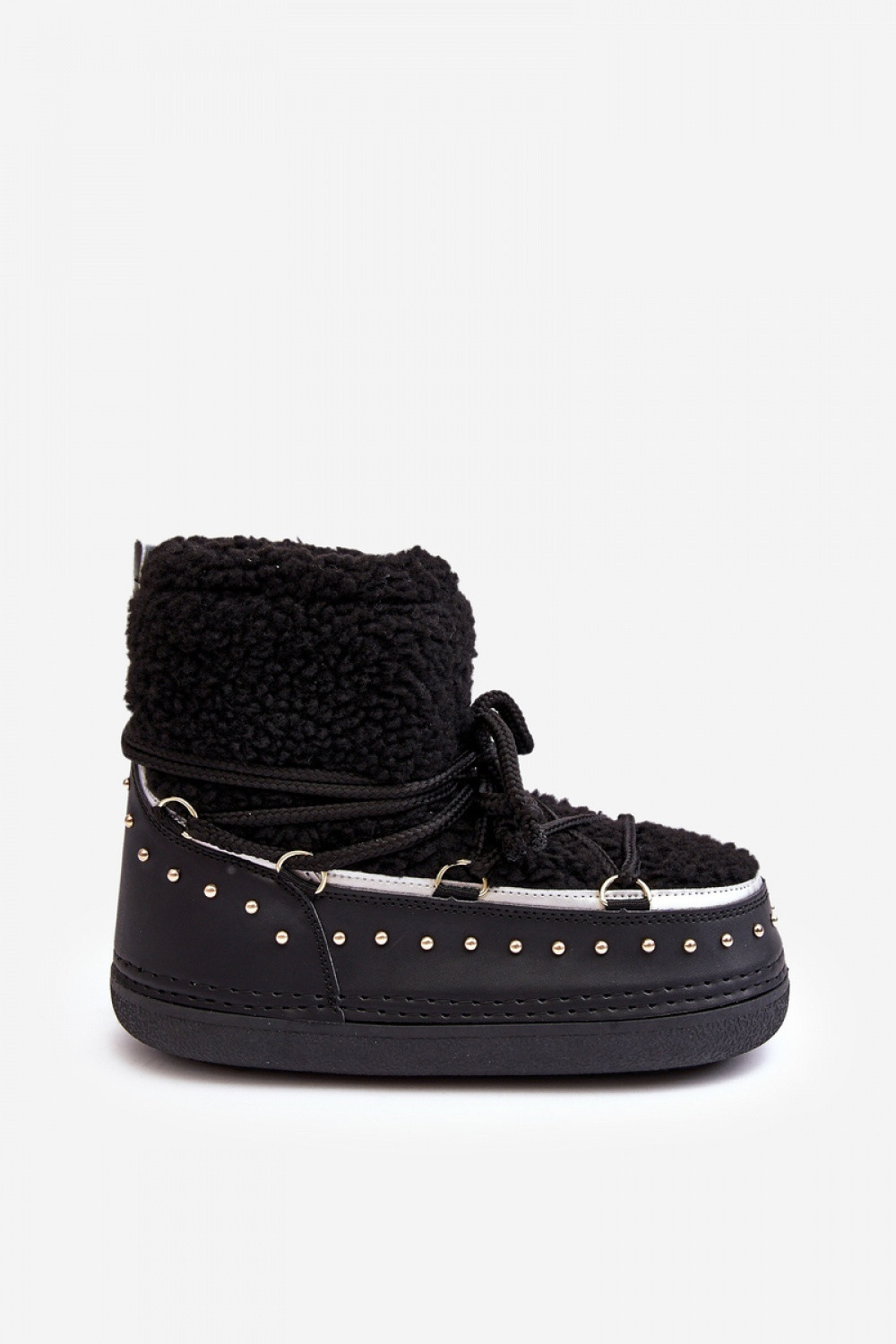 Jedinečné dámské sněhule jsou vyrobeny z materiálu odolného proti chladu a větru. Svršek s umělou ovčí kůží a cvočky bude ideální pro podzimně-zimní období. Klasický nazouvací model s přídavným šněrováním. Sněhule byly usazeny na masivní platformě. Uvnitř mají izolaci v podobě pěny a deky na boty, která poskytuje vysokou ochranu v chladných dnech.