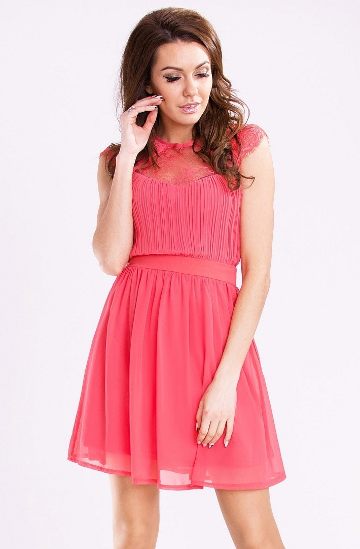 Dámské společenské šaty s rozšířenou sukní a krajkou v živůtku. Zapínání na zip a knoflíček na zadním díle.