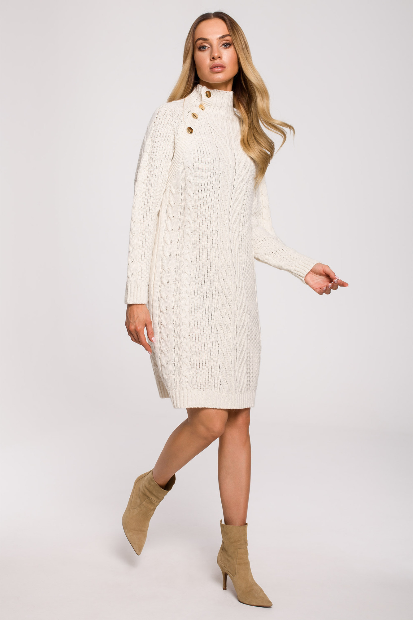 Elegantní a útulné svetrové šaty s ozdobnými zlatými knoflíky ve vysokém límci jsou základem šatníku.