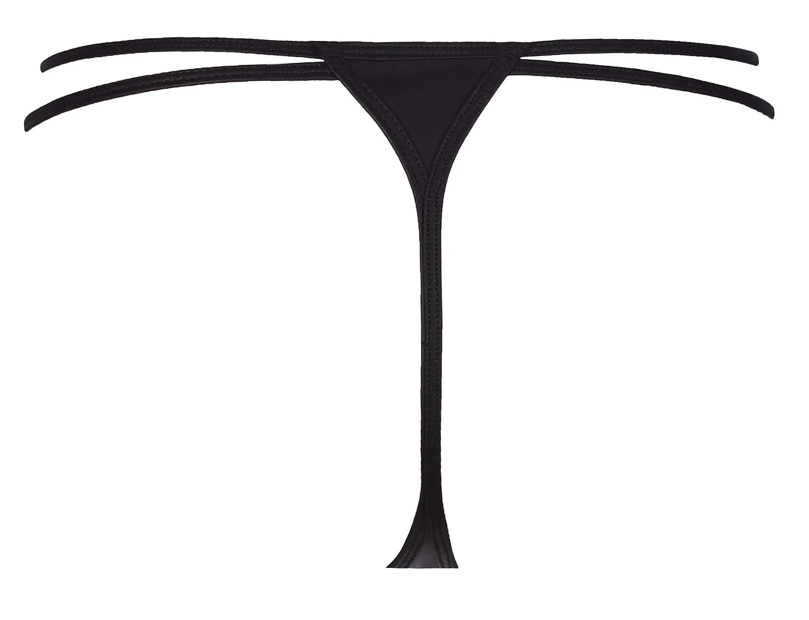 | Černé stringy se smyslným střihem V-8348 jsou vyrobeny z latexu s matnou povrchovou úpravou. Hedvábně černá barva zdůrazní hebkost vaší pokožky. Celá sada stringů a podprsenky V-8341 je skutečným potěšením pro smysly.