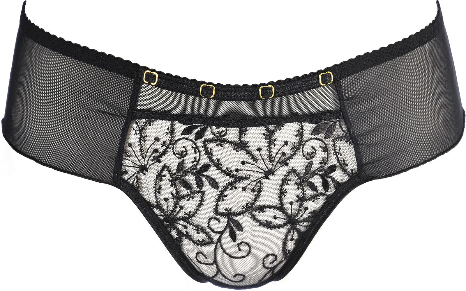Černé kalhotky jsou navrženy tak, aby upoutaly pozornost, přední část kalhotek zdobí květinový vyšívaný vzor, který působí lehce a romanticky.