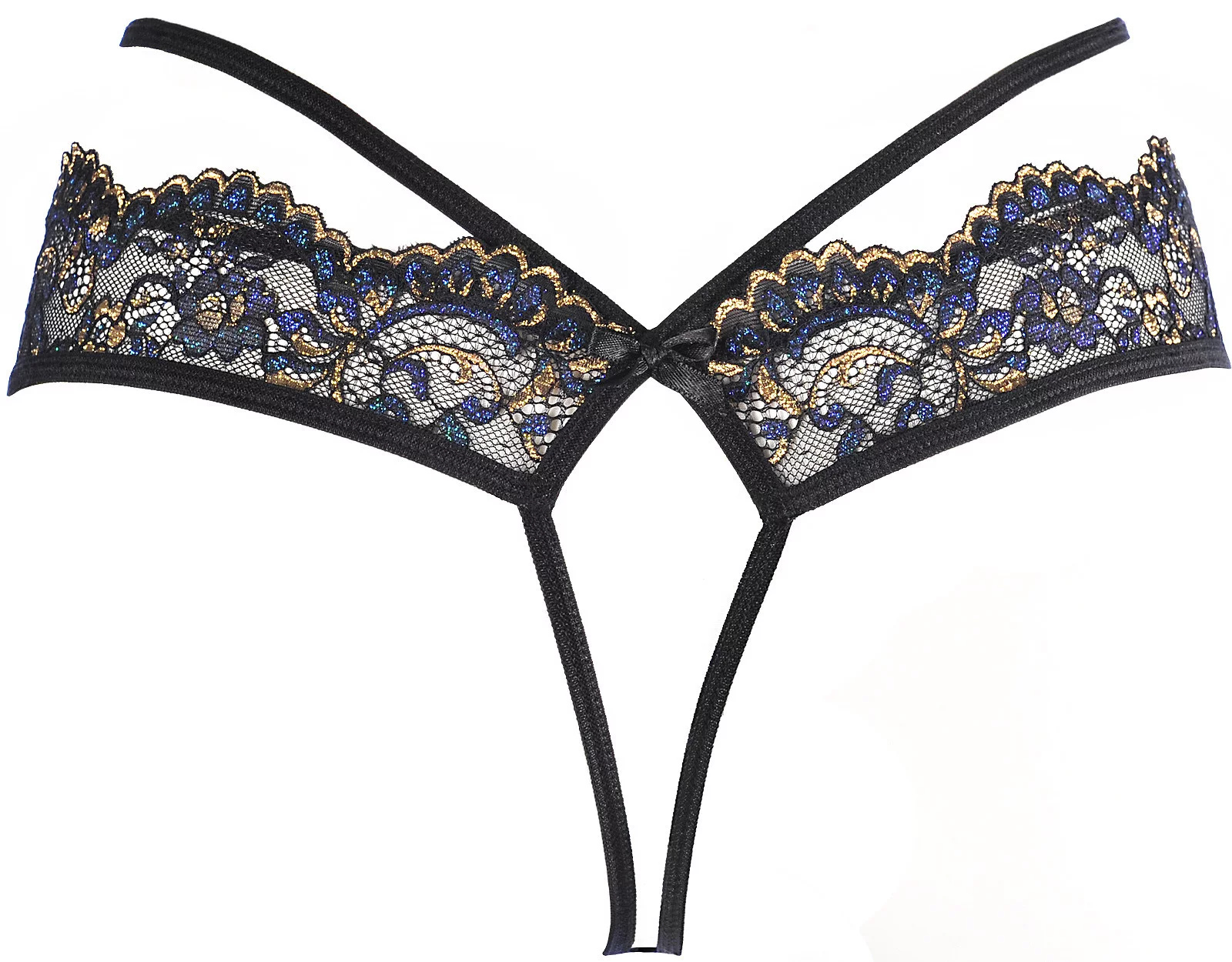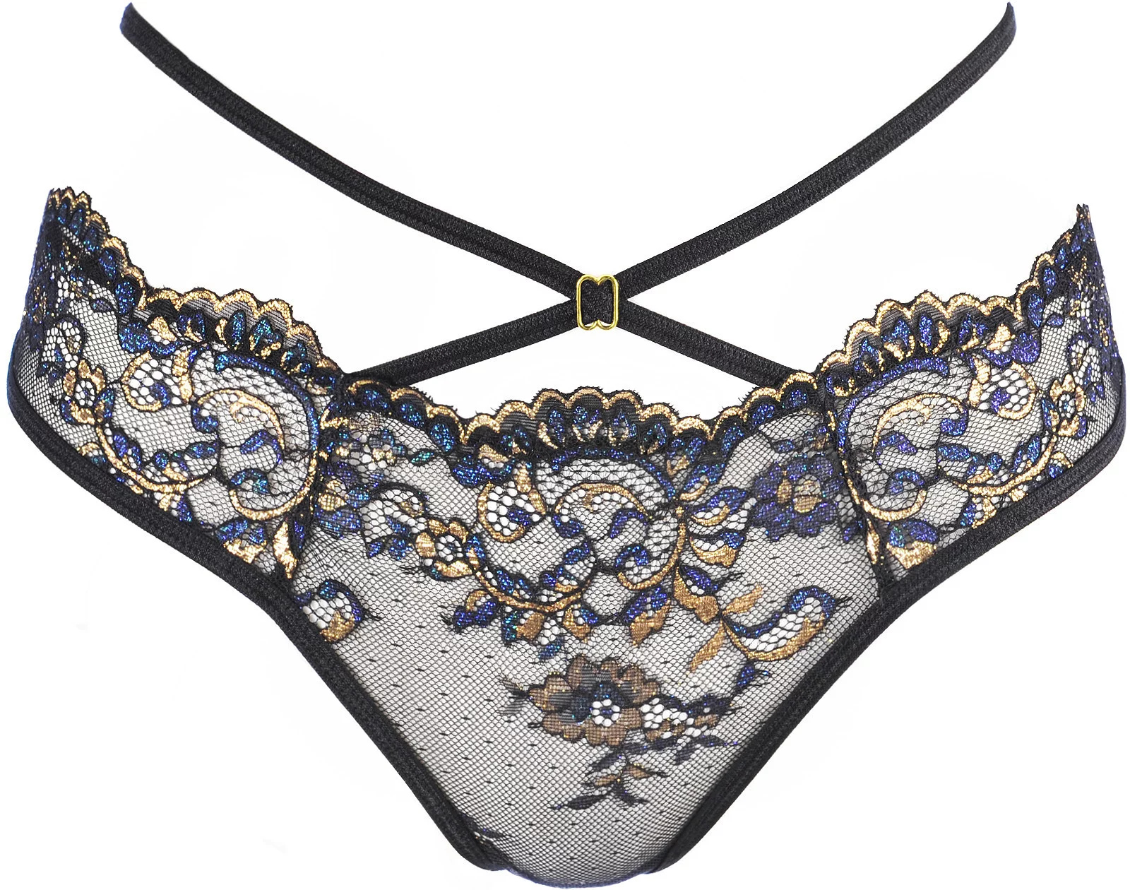 Lehká, ale výrazná tanga jsou hravým doplňkem pro večer ve dvou. Kalhotky mají snížený pas a přes břicho se kříží dva zlatě zdobené pásky. V zadní části svůdný geometrický výřez zvýrazňuje tvar hýždí a je zakončen černou mašlí.
