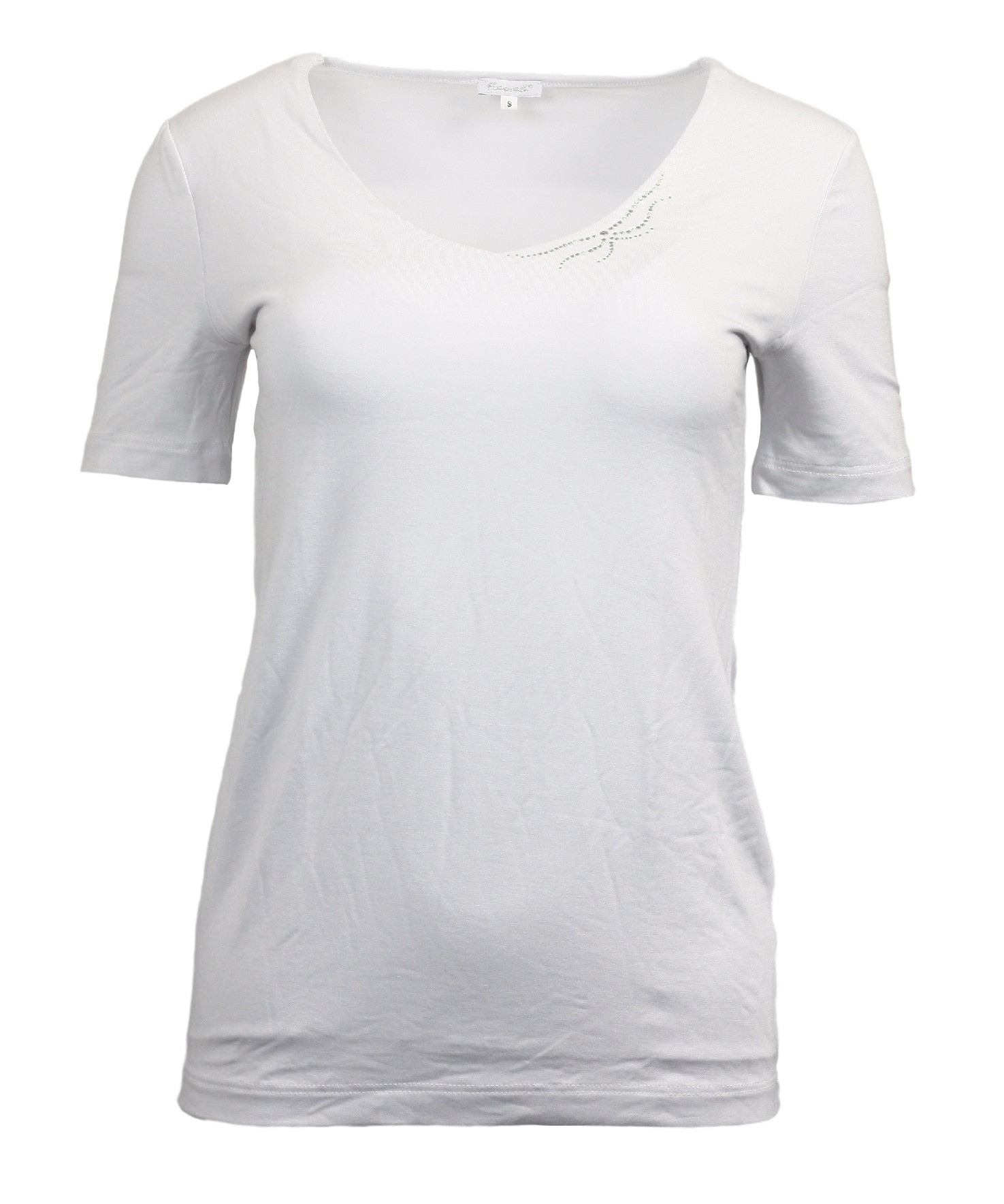 Elegantní bílé triko Linaka s výstřihem do V dozdobený kamínky Svarovski elements. Přední díl má dvojité podšití.