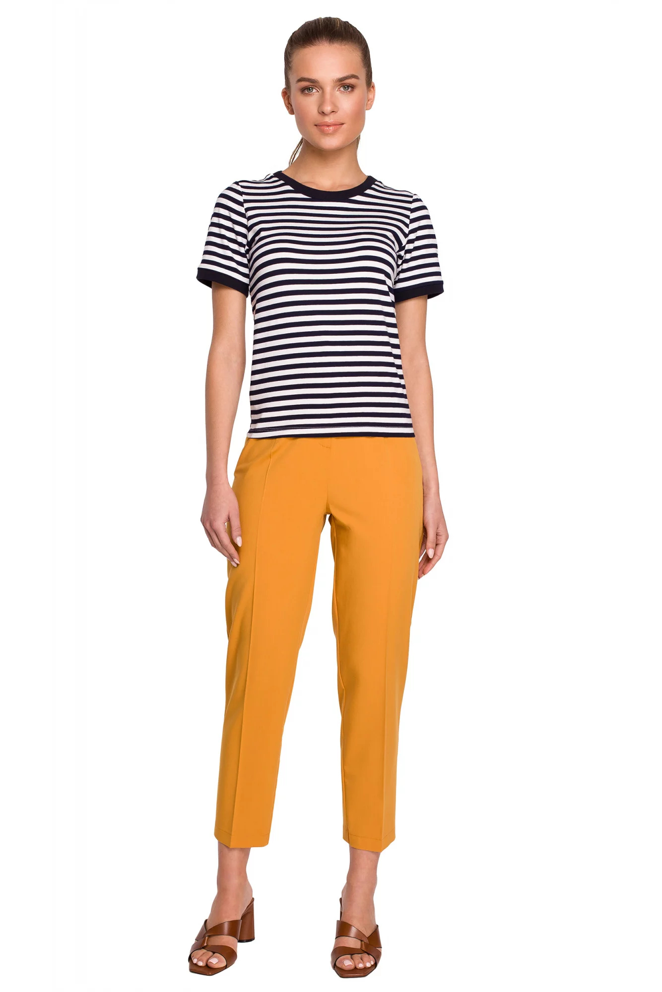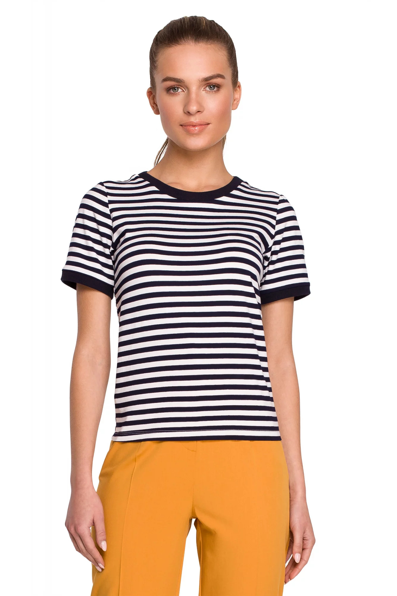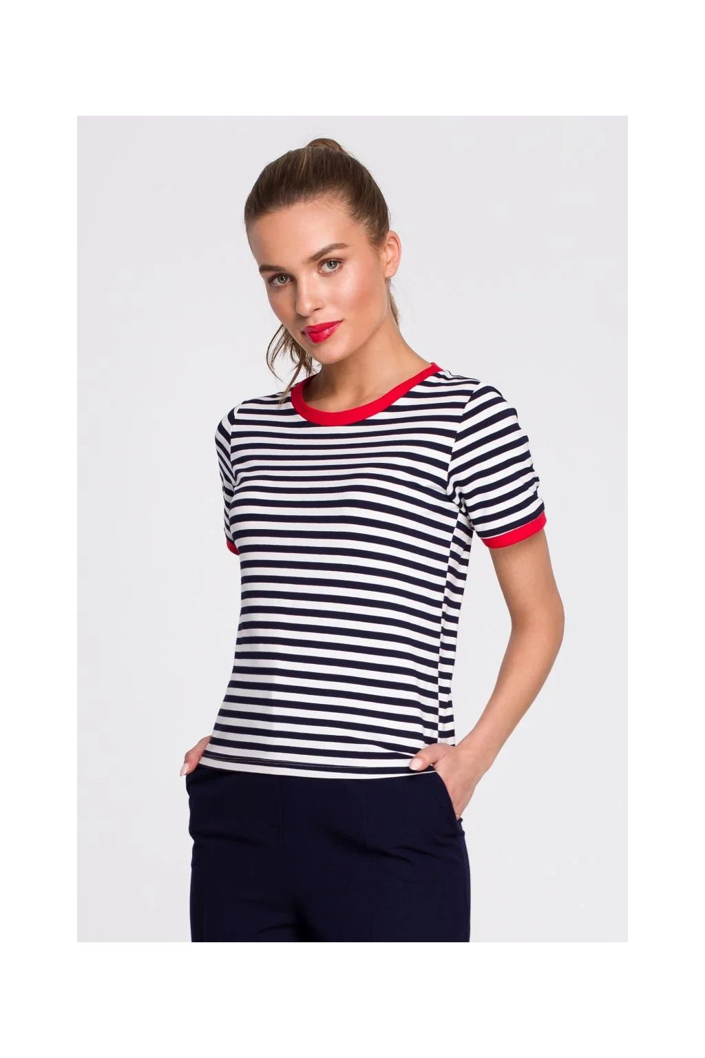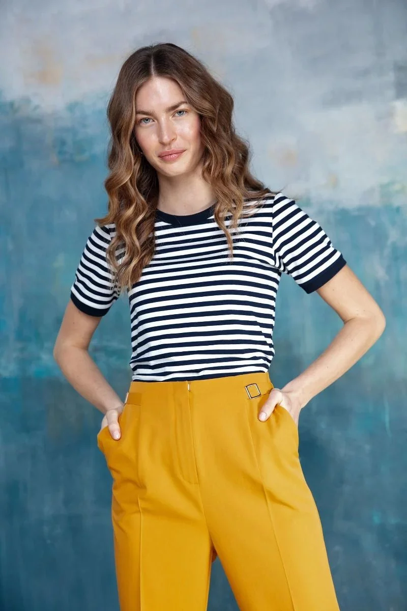 Klasické námořnické pruhované tričko s kontrastním lemem u krku je základem letního šatníku.