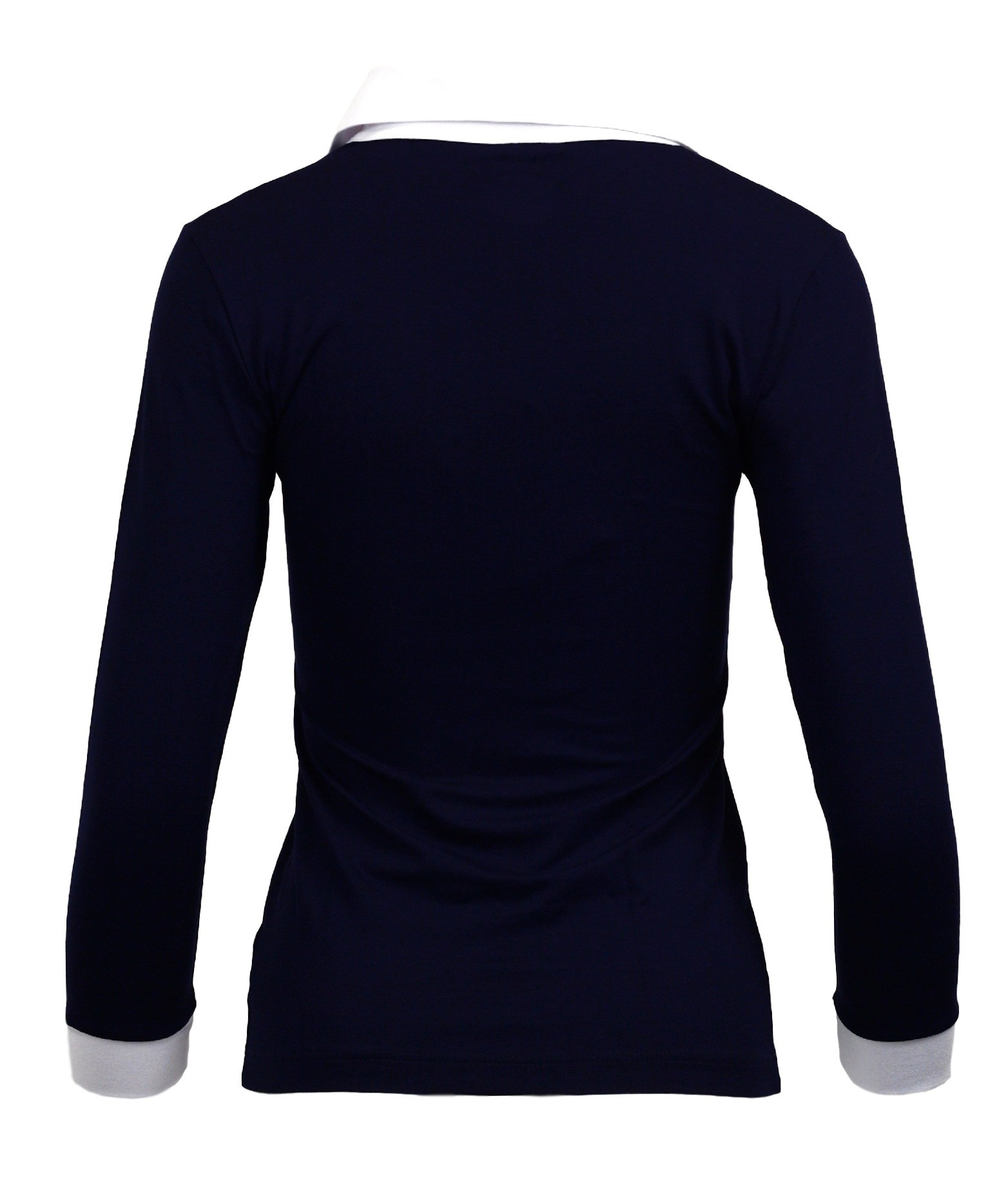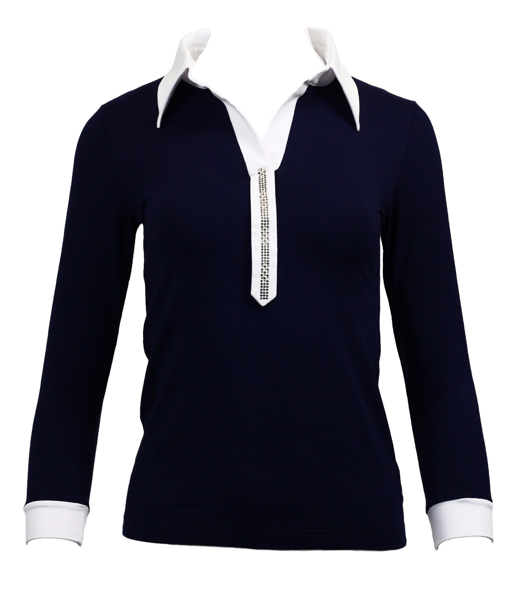 Elegantní dámská halenka Favab košilového střihu, tmavě modré barvy s bílým límečkem a lemováním kolem rukávků.Léga zdobená malými kamínky, které oživují vzhled celé halenky. Materiál: 94% viskosa, 6% elastan
