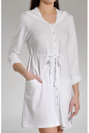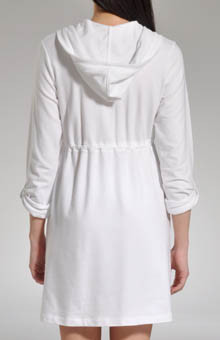 Dlouhý dámský župan značky DKNY. Župan s kapucí a dvěmi kapsami je po celé délce propínací se zavazováním uprostřed. Zdobí jej barevná léga na zapínání s druky.