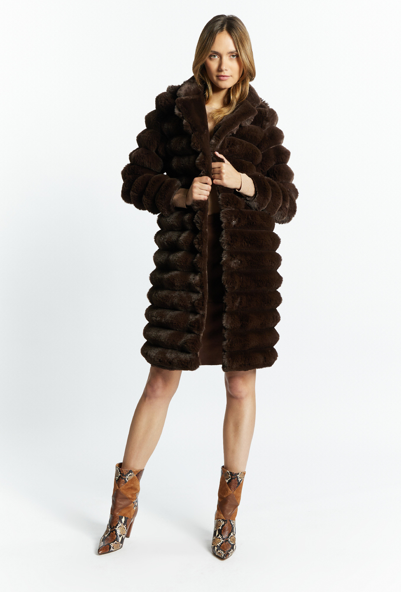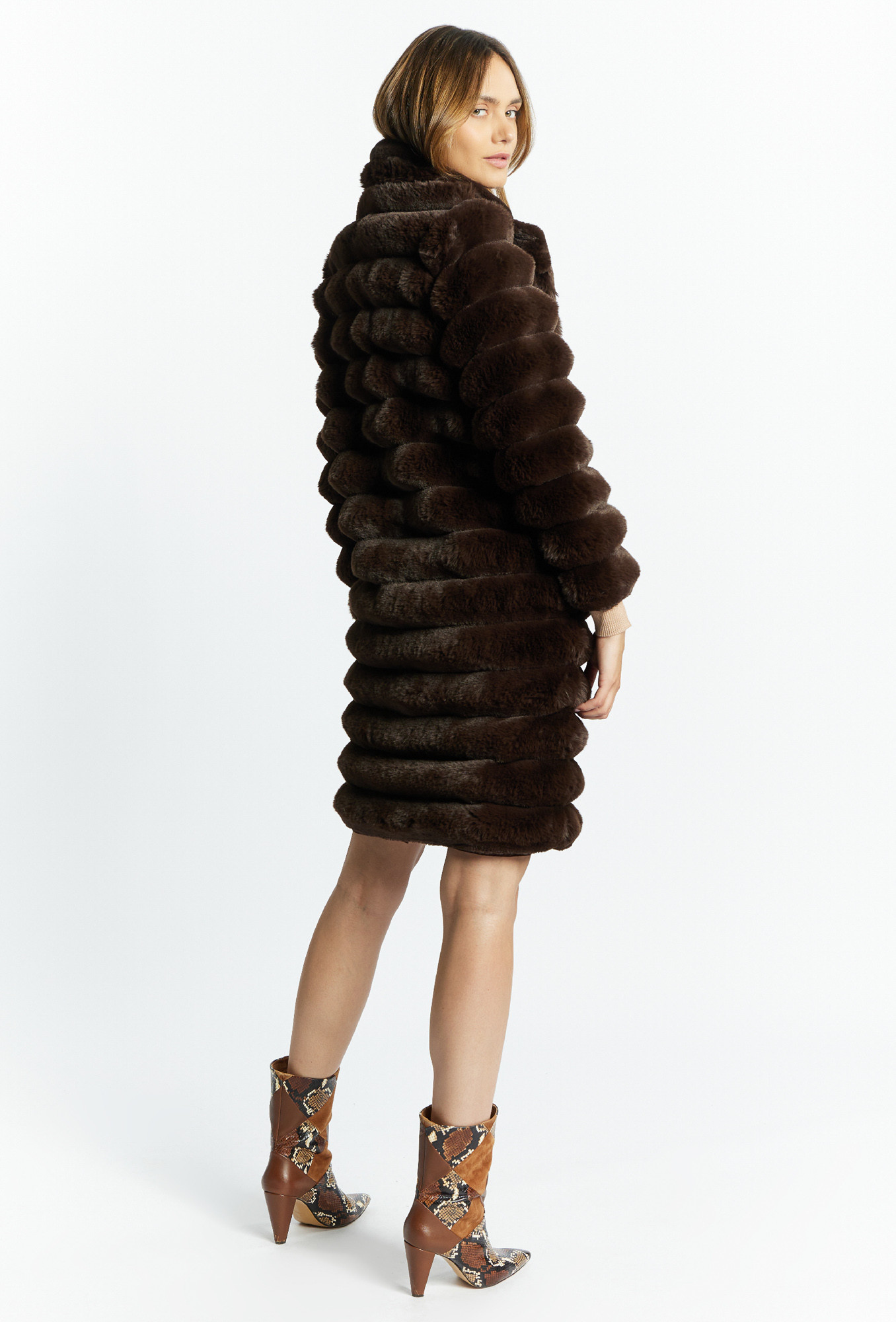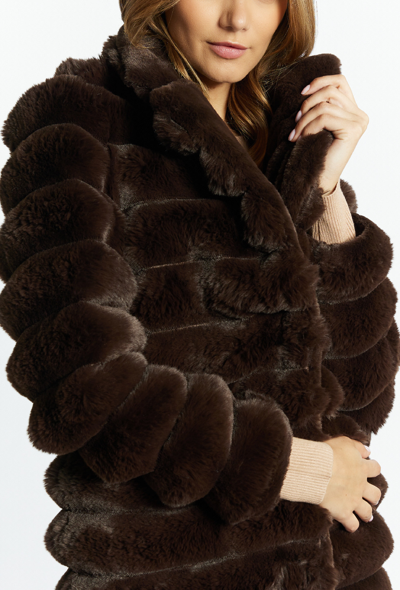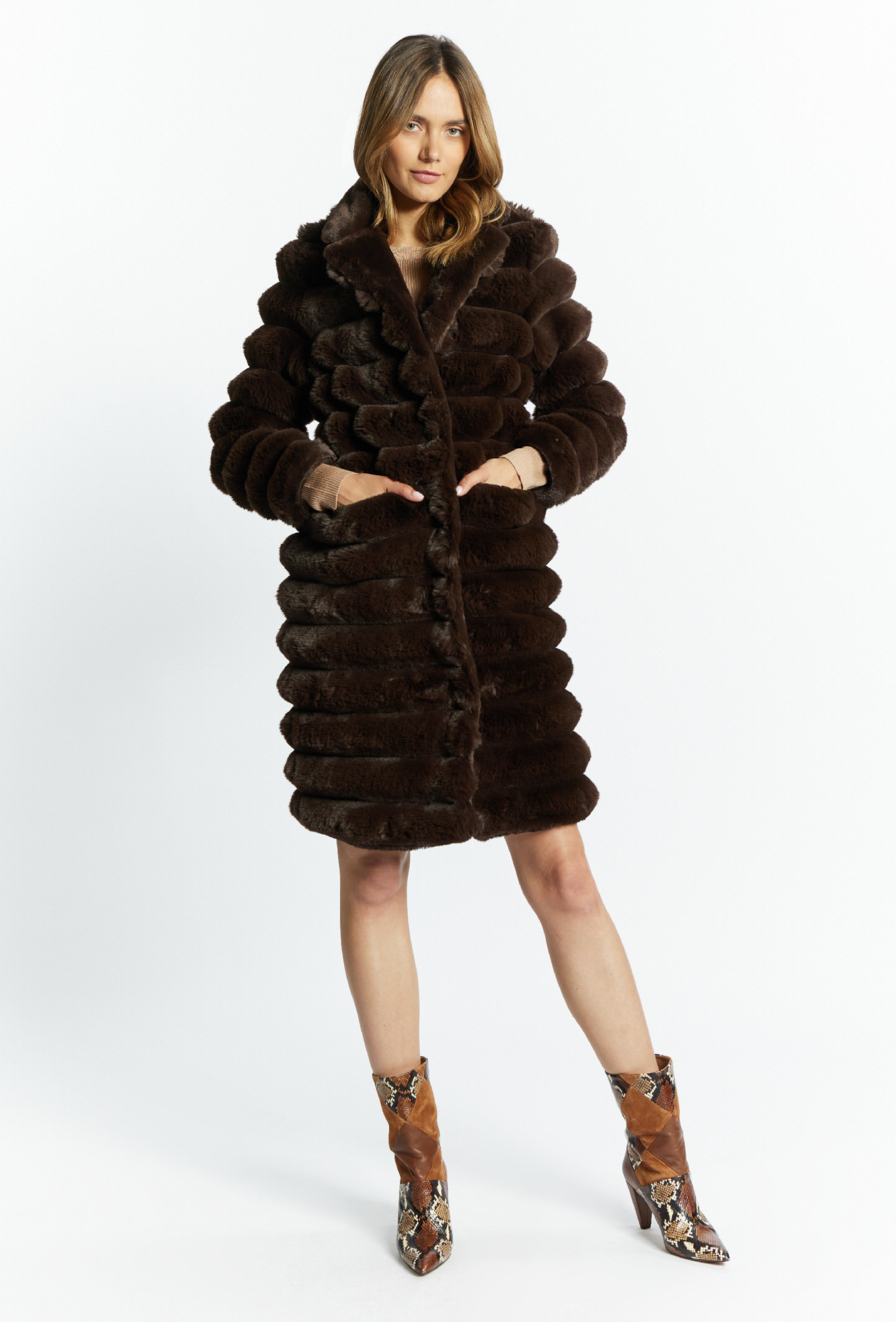 Prošívaný dámský kabát z umělé kožešiny. Kabát s klopami, dlouhými rukávy a dvěma zapuštěnými kapsami. Kabát se po celé délce zapíná na patentku. Tento model bude jistě fungovat i v chladnějších dnech. Modelka na obrázku je 177 cm vysoká a má velikost 36.
