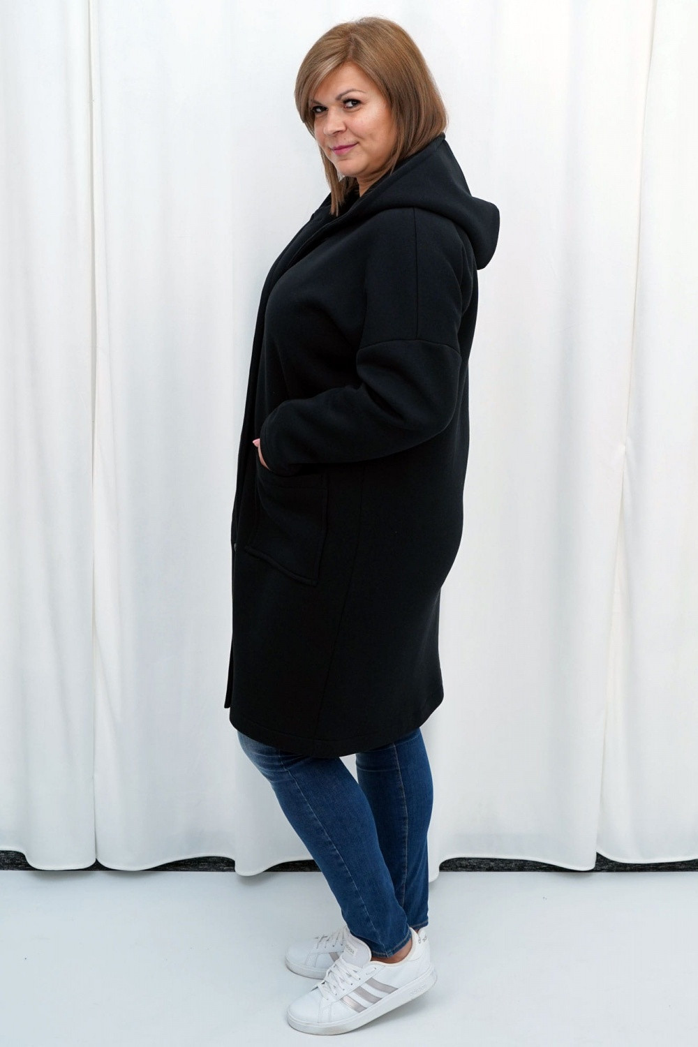 Dámský kabát Latoszka je ideální jako svrchní oděv pro podzimní nebo chladnější zimní dny. Zapíná se na ozdobné knoflíky. Má hlubokou kapuci a prostorné kapsy. Model má dlouhé rukávy a délku ke kolenům. Je velmi funkční, s vysokým zapínáním, tak akorát do větrných dnů. Byl ušit výhradně v Polsku v našich šicích závodech z nejkvalitnějších úpletů. Bude skvělým doplňkem mnoha stylizací. Poskytne vám pocit pohodlí a módní vzhled a zároveň vás zahalí do tepla. Latoszka je náš jedinečný návrh, který je kombinací pletené mikiny a pohodlného kabátu. Tento model si zamilují všechny milovnice sportovní elegance i dámy, které chtějí mít ve svém šatníku originální a jedinečné oblečení. Největší předností kabátu Latoshka je jeho velká univerzálnost, díky níž se hodí jak pro každodenní, tak i oficiálnější situace. Pokud jej zkombinujete se sportovní obuví, pohodlnou teplákovou soupravou a prostorným batohem, získáte outfit ideální na výlet do hor, piknik nebo projížďku na kole. Pokud naopak kabát Latoszka zkombinujete s kalhotami obepínajícími postavu, lehkou halenkou a jehlovými podpatky, vytvoříte outfit, který můžete snadno prezentovat v kanceláři, při odpolední kávě s kamarádkou nebo při cestě do kina.