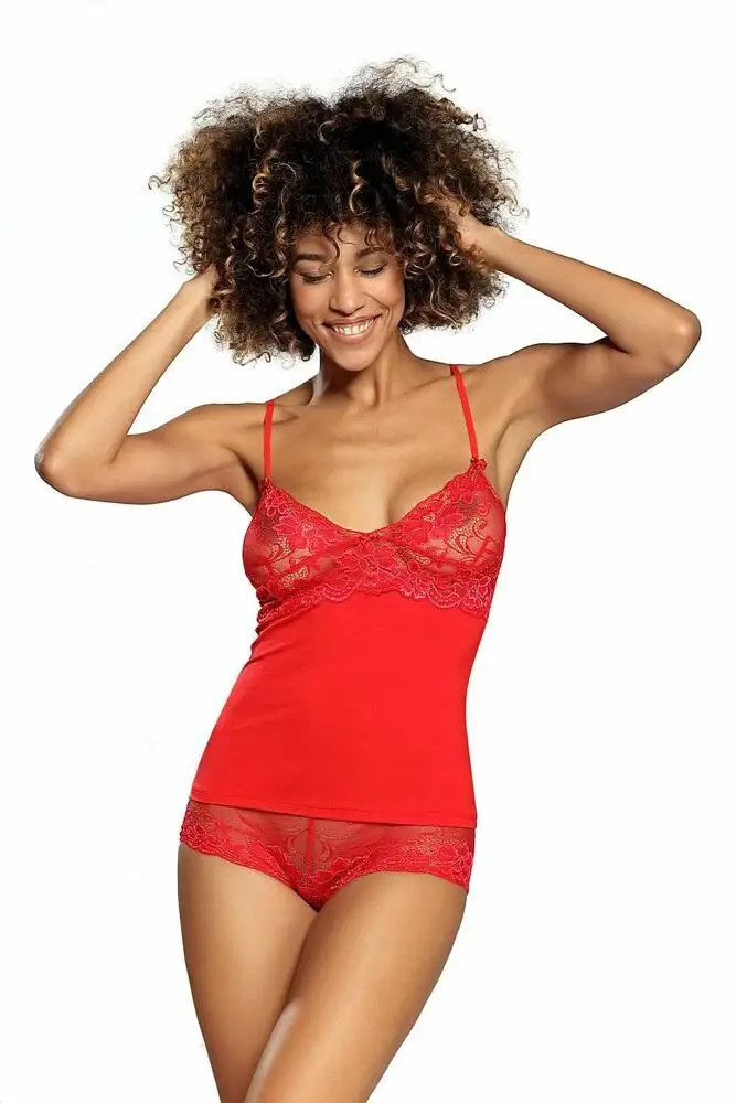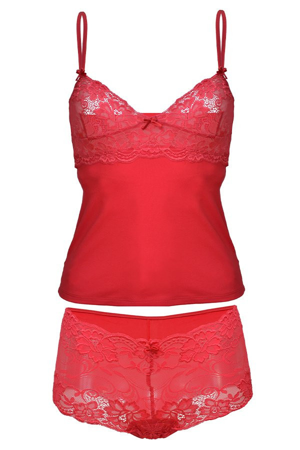Komplet Viktorie v červené barvě. Tvoří jej košilka, která je v oblasti poprsí zdobená poloprůhlednou pružnou krajkovou látkou s květinovým motivem. Úzká ramínka jsou elastická. Komplet je převážně vytvořený z velice příjemného elastického materiálu (microfibra). Součástí jsou také kalhotky s vyvýšeným pasem tvořené nádhernou pružnou krajkovou látkou v přední části.