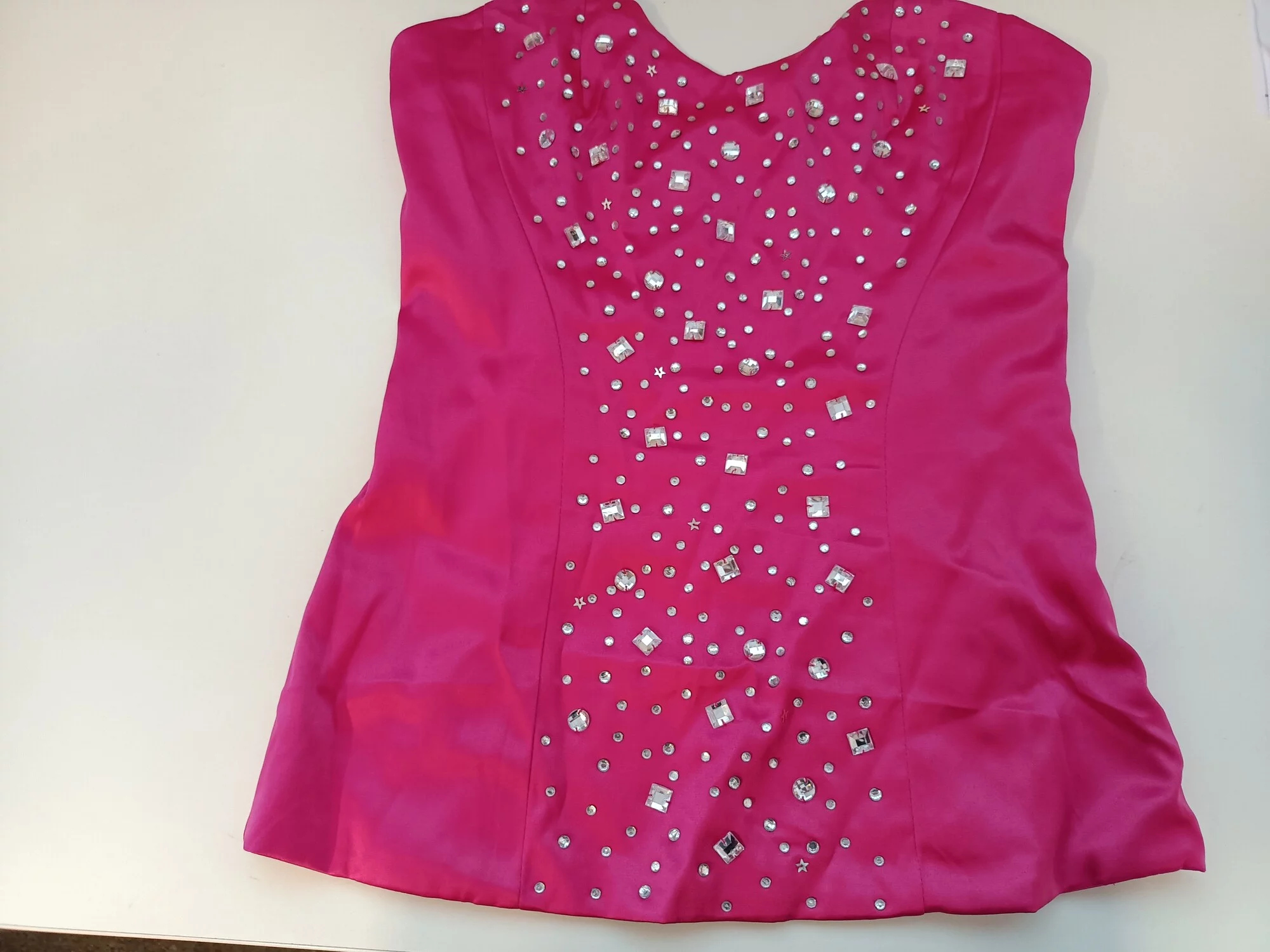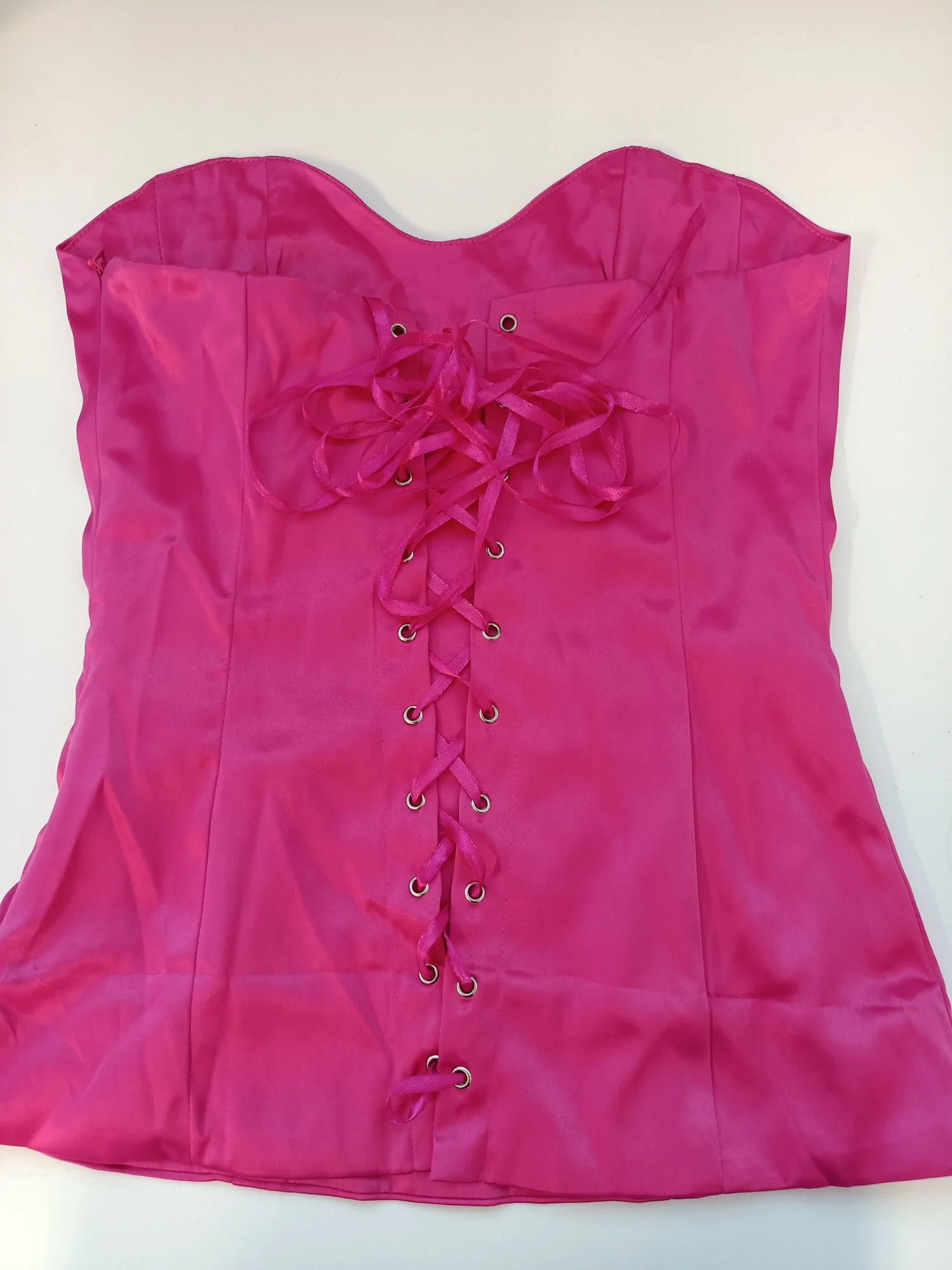 Dámský saténový korzet bez rukávů, podšitý. Přední díl pošitý kamínky Swarowski. Zavazování na zádech. Na boku zapínání na zip. Všité boční kostice.