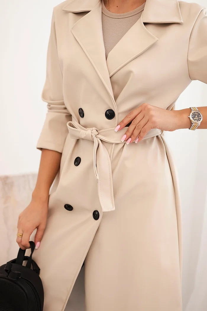 Elegantní dámský kabát s klasickým, prodlouženým střihem je skvělým návrhem na podzimní a zimní sezónu pro ženy, které ocení styl a pohodlí. Model je vybaven širokým límcem, praktickými kapsami a páskem v pase, který krásně zvýrazňuje siluetu. Délka nad kolena a dvojité zapínání na knoflíky dodávají kabátu elegantní, nadčasový charakter.