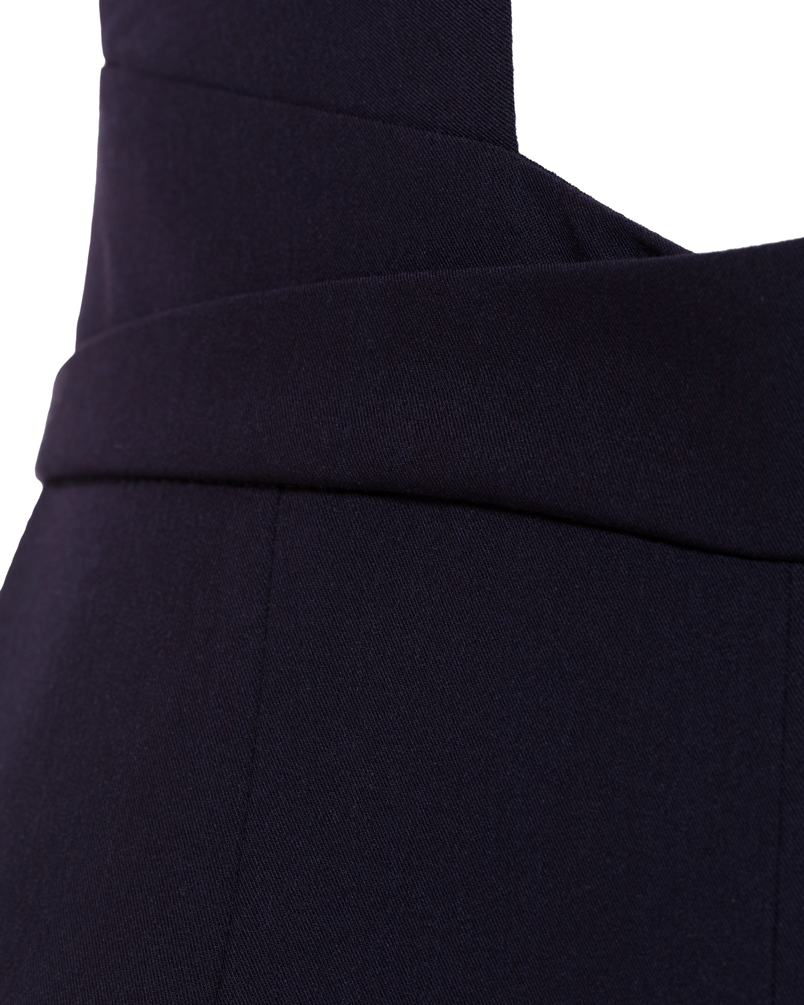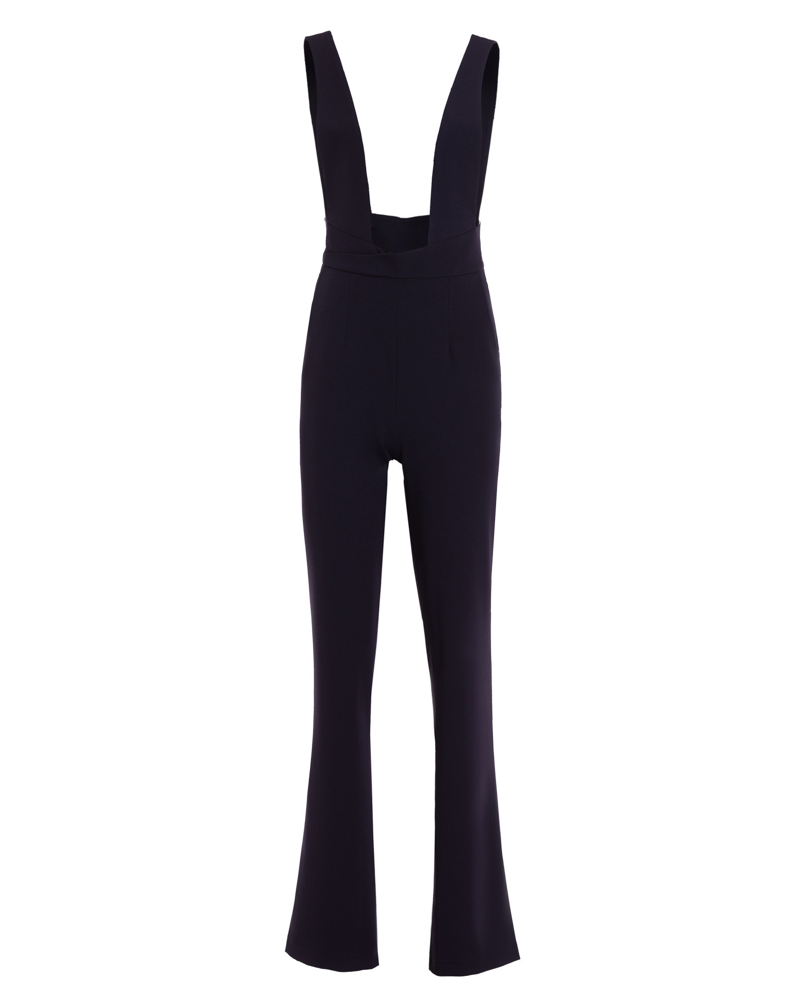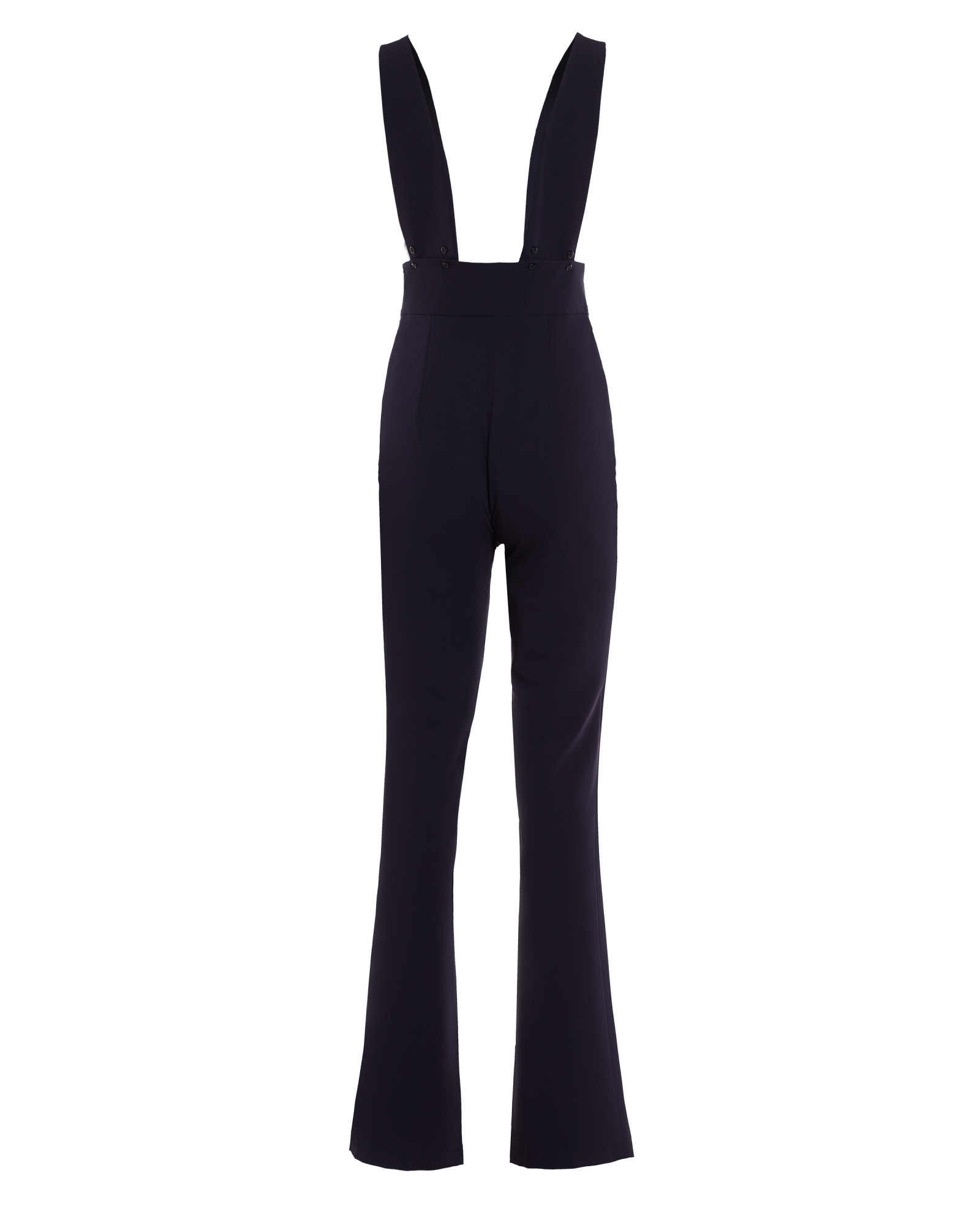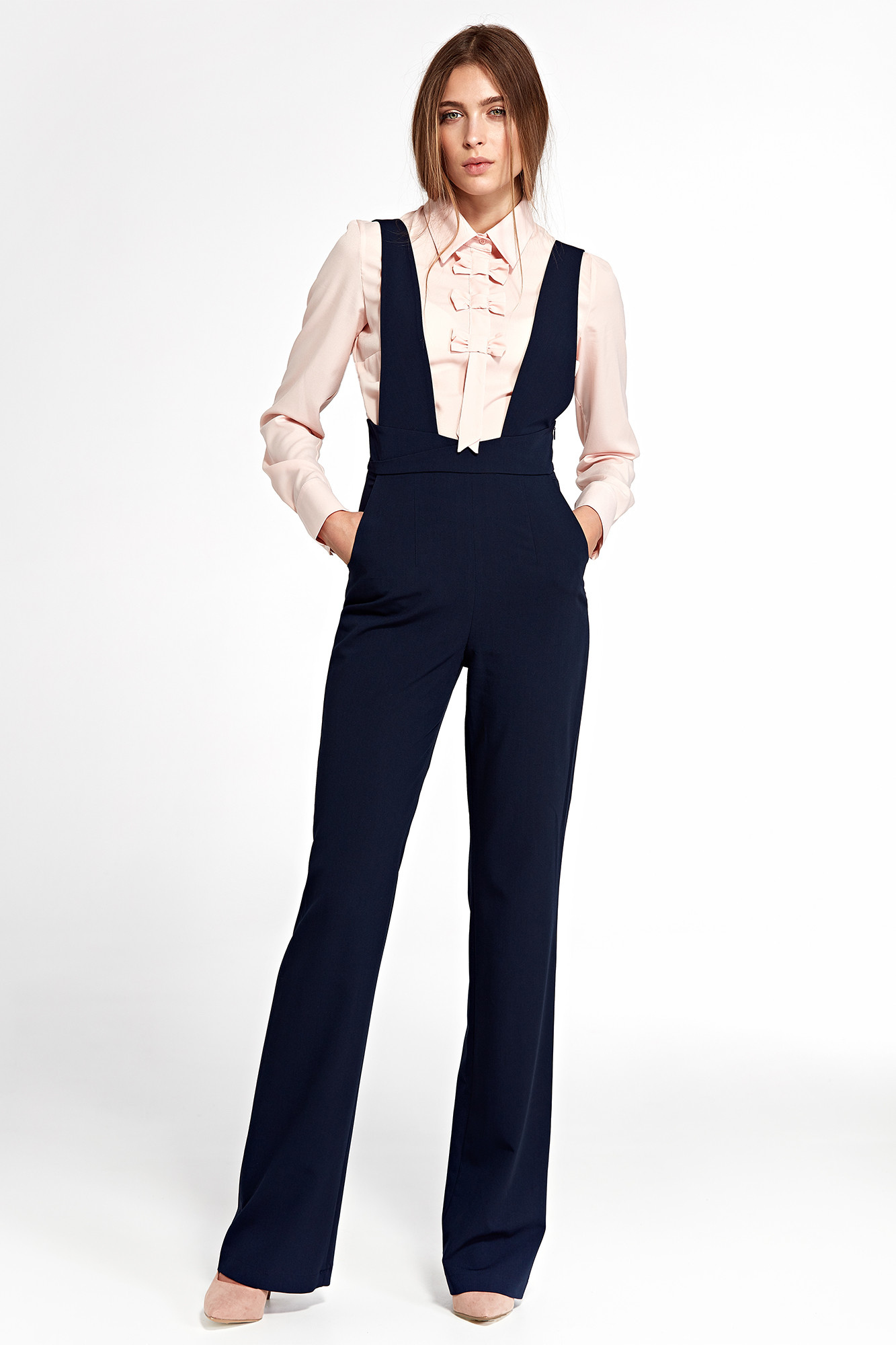 Overal s vysokým pasem, širokými ramínky, zapínáním na knoflíky na zádech, všitým zavinovacím páskem a zipem na boku.