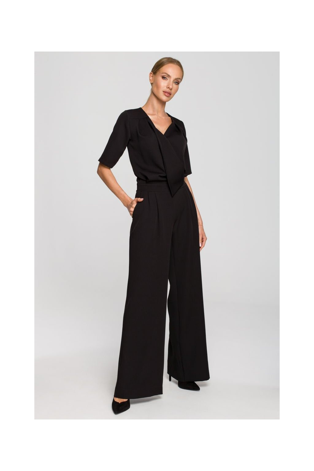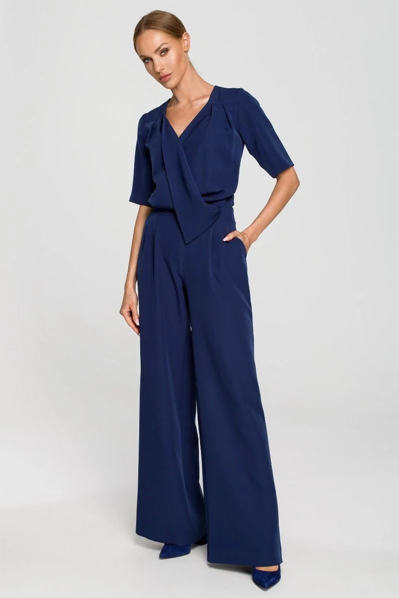 Kalhotový oblek pro zvláštní příležitosti s rukávy po lokty, obálkovým vrškem, záševky a kapsami. Široká nohavice. Zapínání na krytý zip.