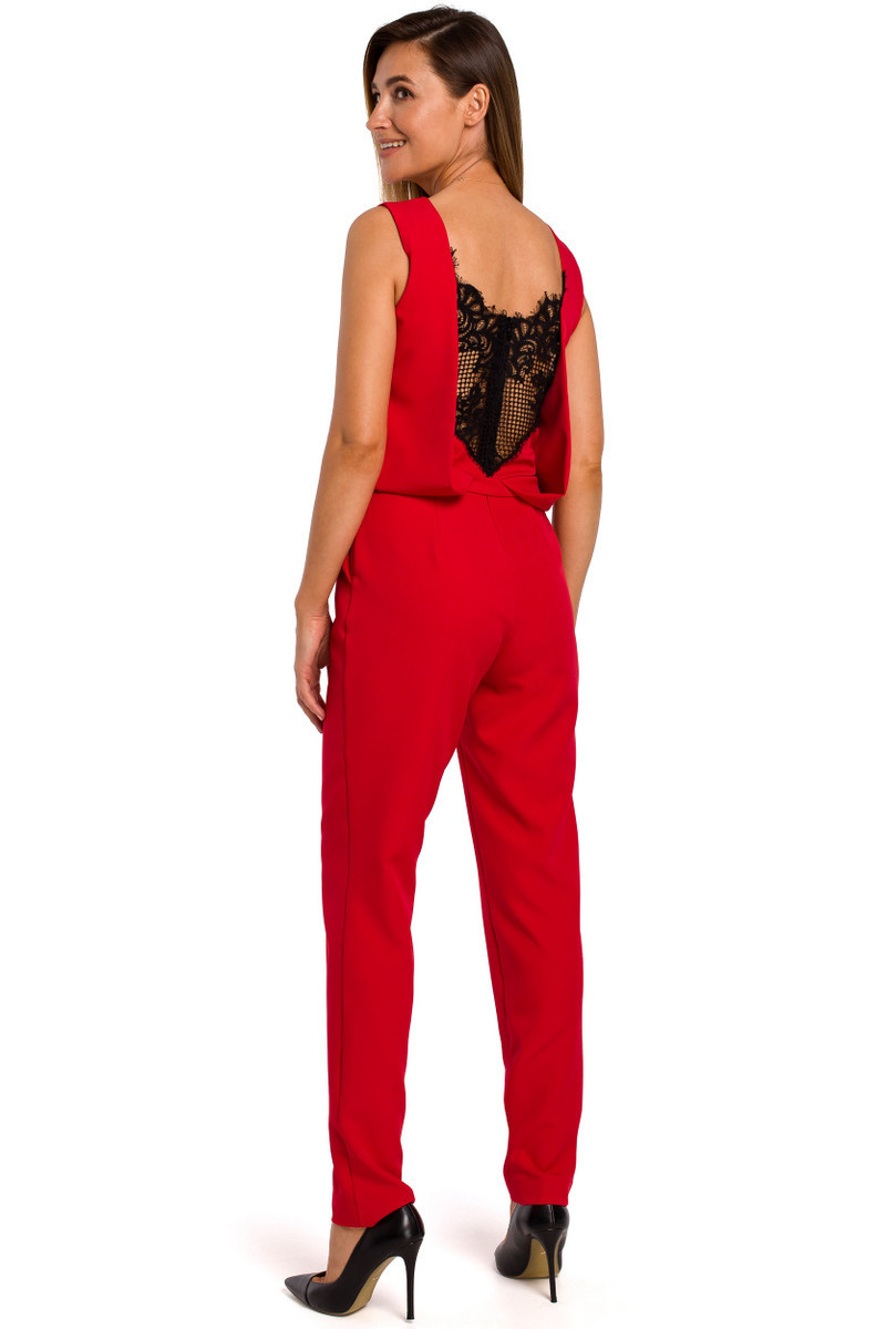 Dokonalý večerní outfit - jednodílný overal s poutavými projmutými zády zdobenými krajkovým panelem.